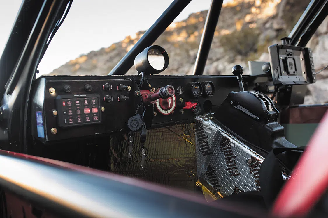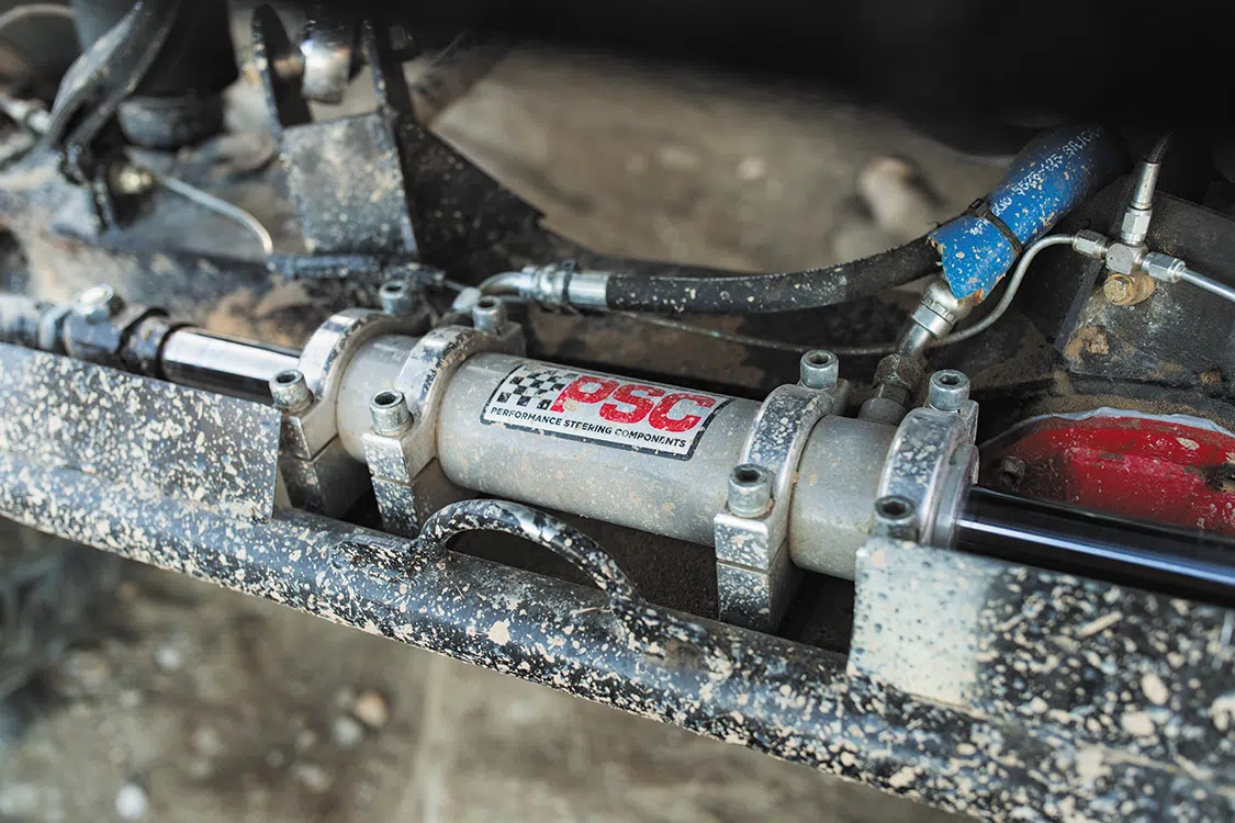 To make sure the suspension was up to race spec, Patrick went with Locked Offroad 2.5, 16-inch stroke coilover shocks and air bump stops on all four corners, giving the rig adequate suspension travel to take on both rock obstacles and fast, wide-open desert sections. Trailing arms with 17 inches of travel in front and 30 inches of travel in the rear were also added, in addition to a full hydraulic steering system, making use of a PSC Motorsports steering ram.