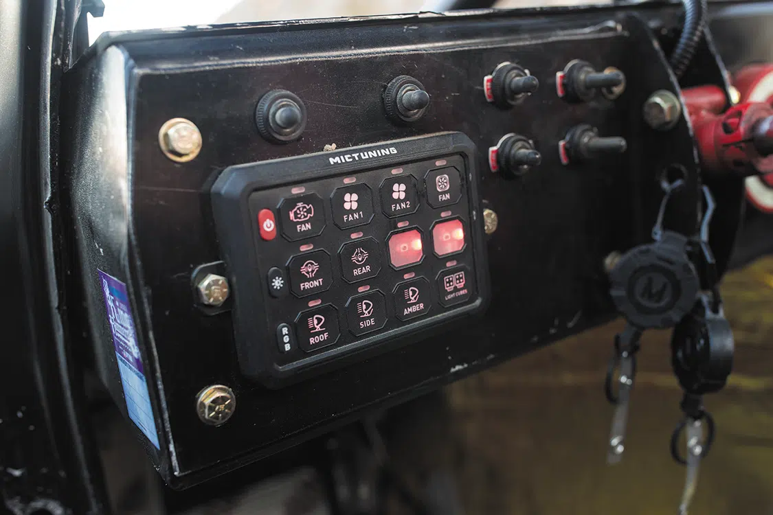 Inside the race car is pretty standard race fare, from PRP Comp Elite suspension race seats to a PRP steering wheel with Motion Pro quick disconnect. The car is also outfitted with a MICTUNING push-button switch panel, Rugged Radios comms system, and a Winter’s Rock Crusher shifter. Air conditioning will come later!
