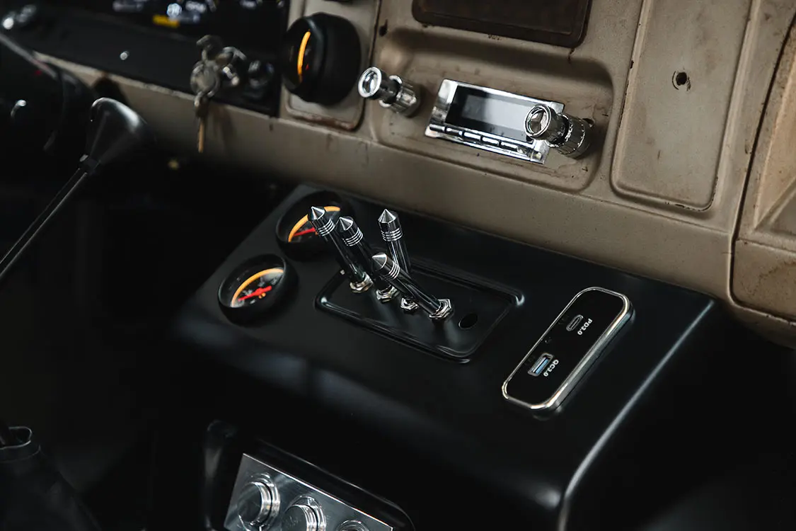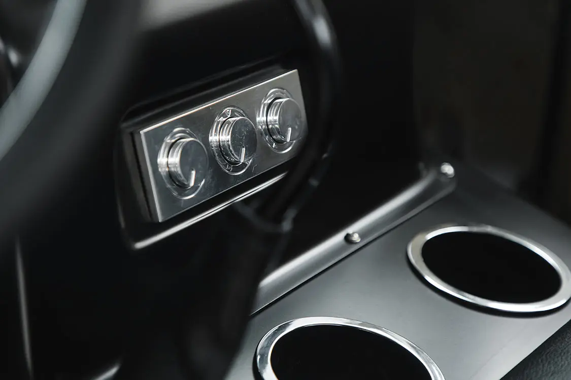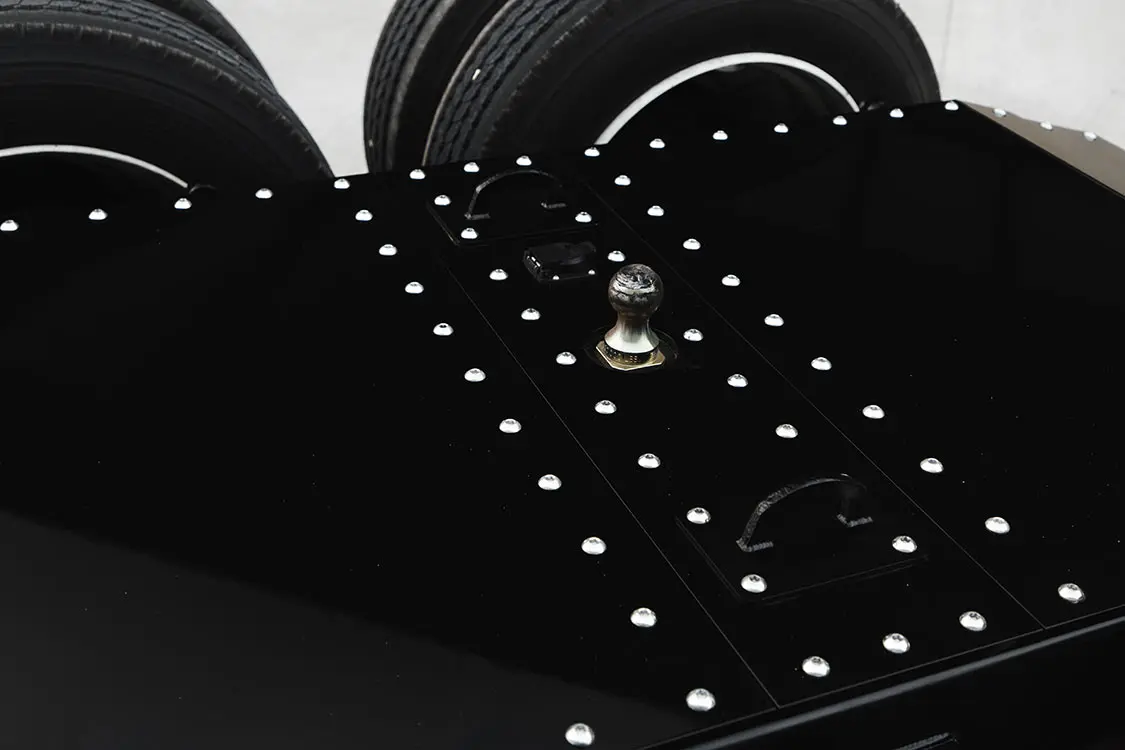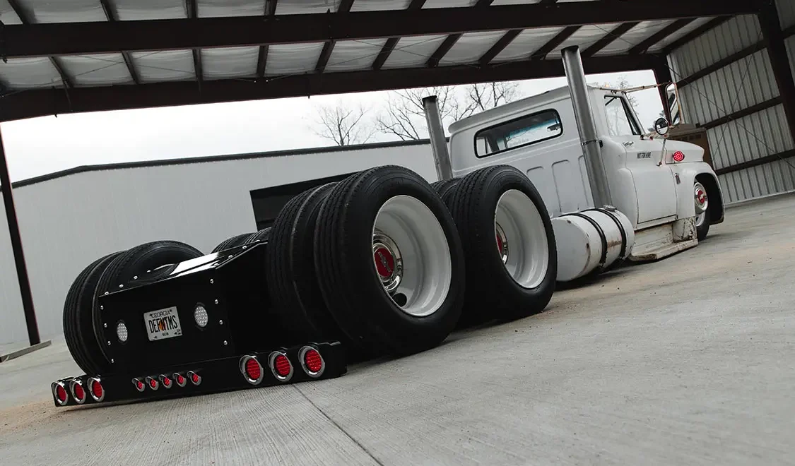 The foundation of the truck is the fully reinforced and modified custom frame, which was upgraded with an independent front suspension and air ride all around. And as tempting as it would have been to bolt on some shiny aluminum wheels, you just can’t beat the look of the original 22.5-inch wheels. Well, almost, because the custom-adapted 10-lug center caps sure do add the perfect finishing touch to the rolling stock, which also include Toyo M122 commercial duty tires.