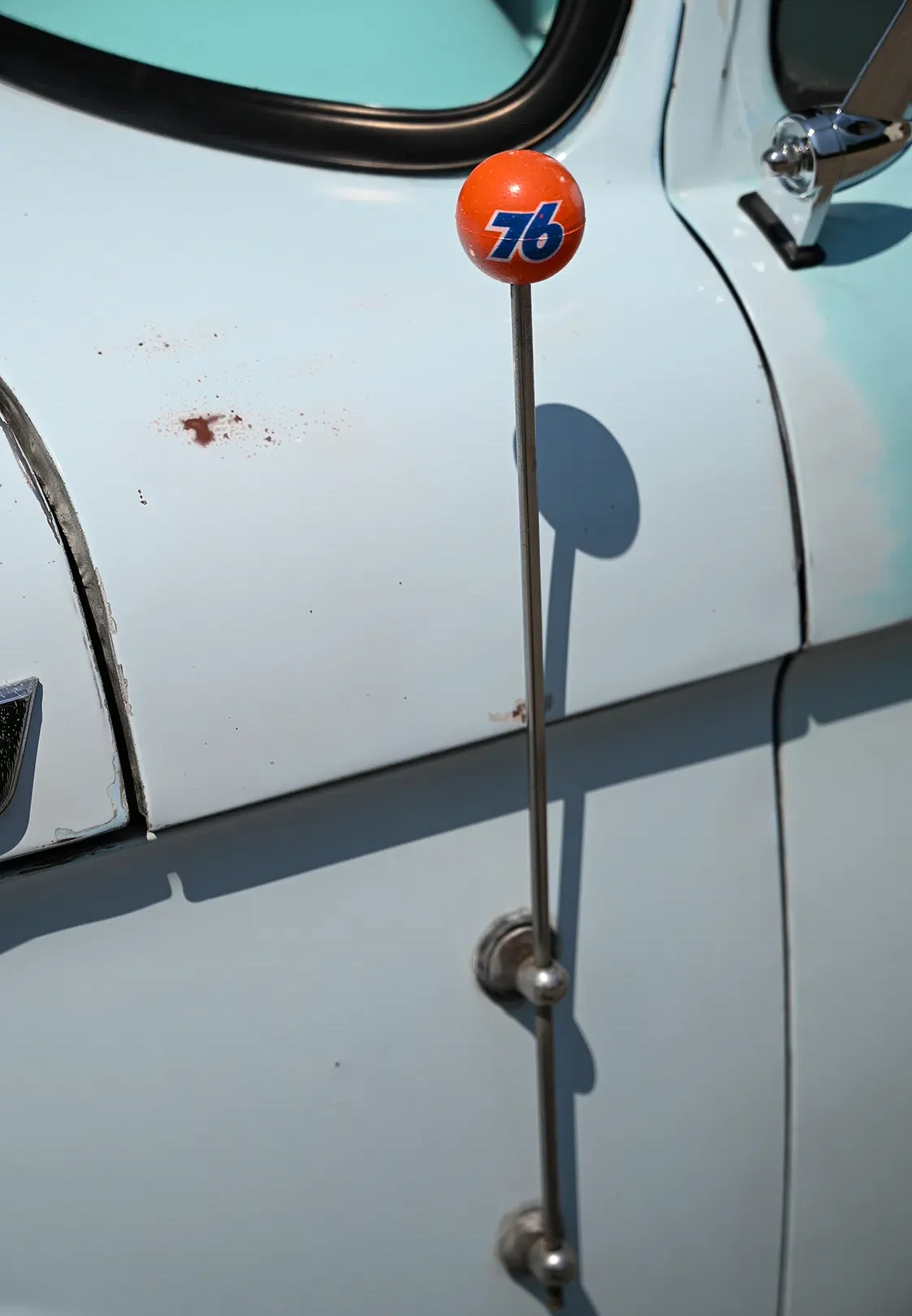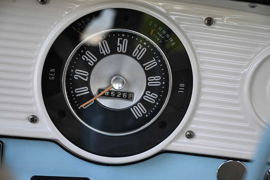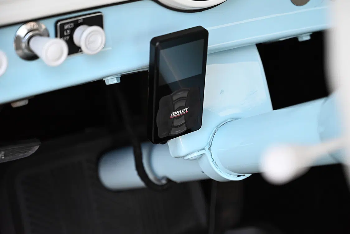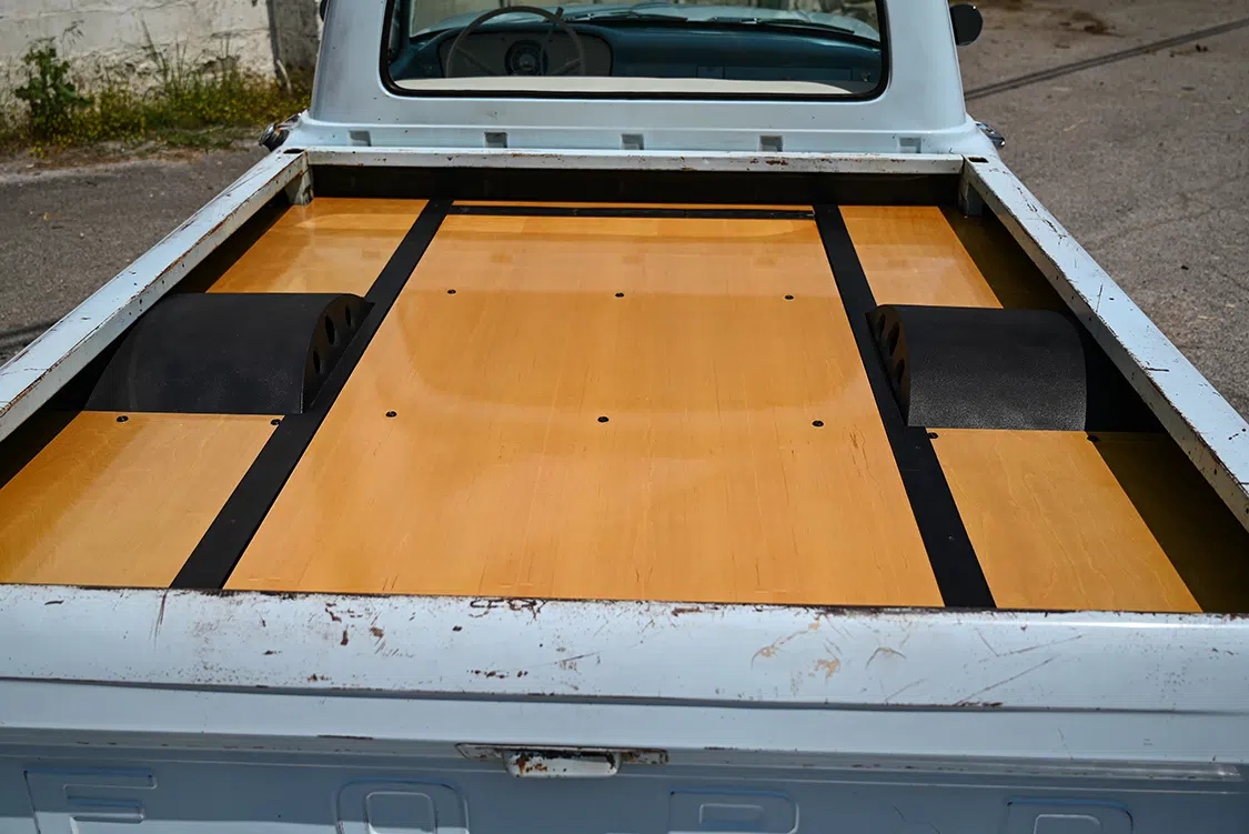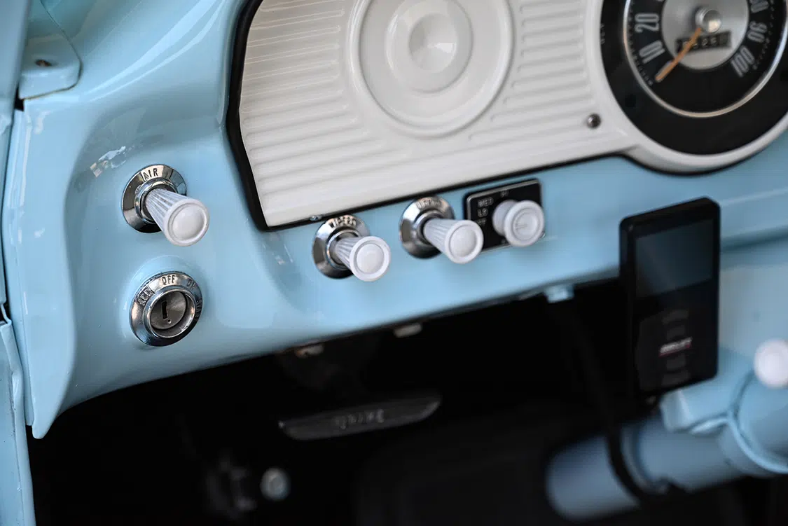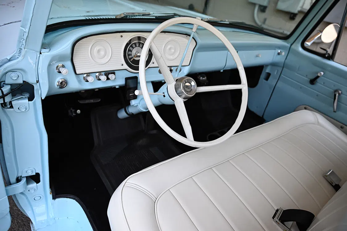 To complete the build, the interior was finished to look original. The rebuilt original stock bench was recovered in white marine-grade vinyl to match the original look. Bob’s Custom Upholstery of Roseville, California, gets the credit for interior and refurbish, while Jason Haskins of Haskins Performance Coatings in nearby Auburn did the interior bodywork and paint—the same Skylight Blue as the exterior—to refresh the inside of the cab. Bob’s added a full carpet kit in black, and he then matched the seats, door panels, and headliner. A Pioneer head unit that powers the Phoenix gold amp and Rockford Fosgate 10-inch sub is located in the glovebox.
