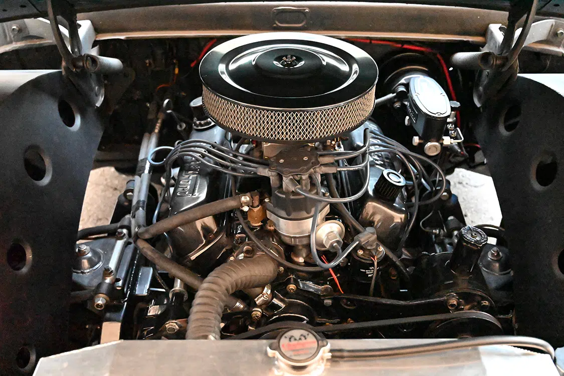 The powerplant comes from a 1974 302 V-8 rebuilt with a small cam and a Holley 650 carburetor. Custom motor mounts and a new Champion radiator and cooling fan were placed between the new frame rails. Valve covers and the air cleaner were powdercoated to match the frame rails and installed. An HEI Distributor was installed, and Hedman headers were matched with a 2.5-inch dual exhaust. He also relocated the battery to below the wood bed floor. Shane completely rebuilt the Ford’s transmission. The original three-speed column and trans linkage were modified to shift automatic and join the power steering rack but retain the three-on-the-tree original factory look. “People look for the clutch,” he says with a laugh.