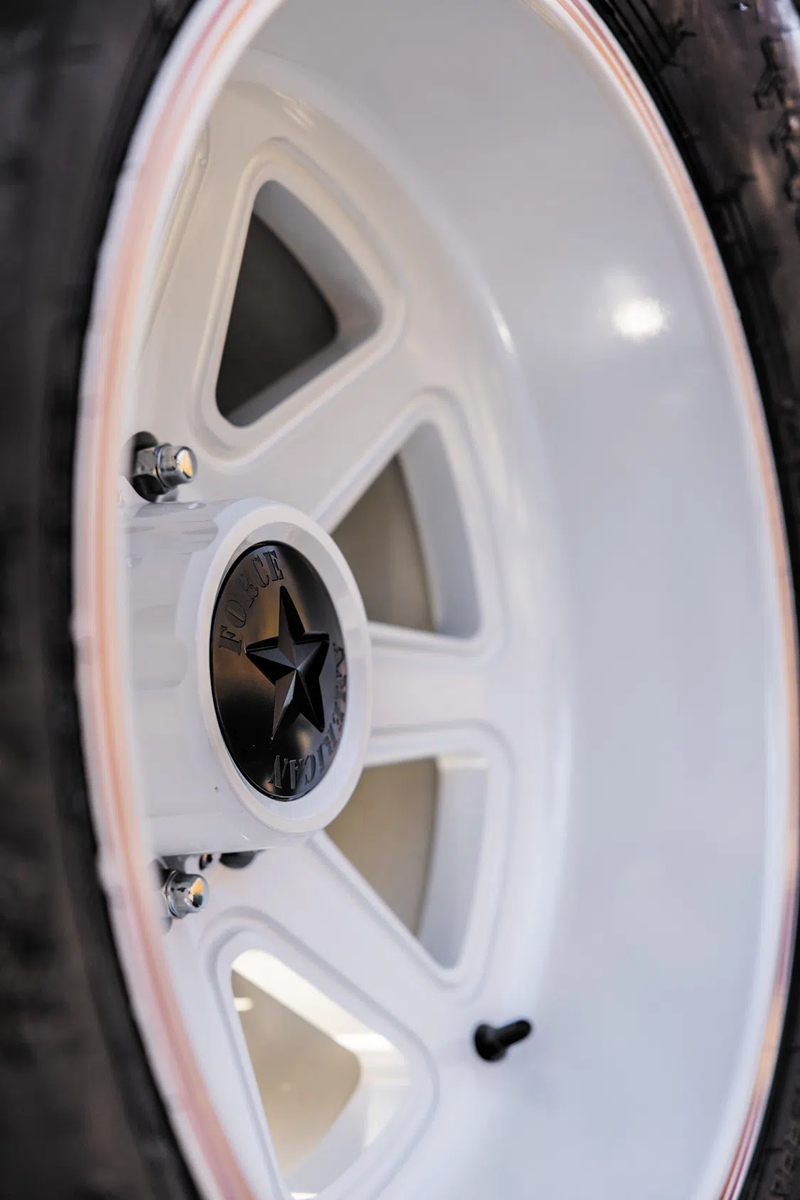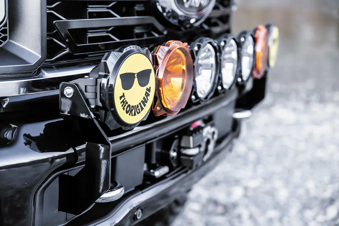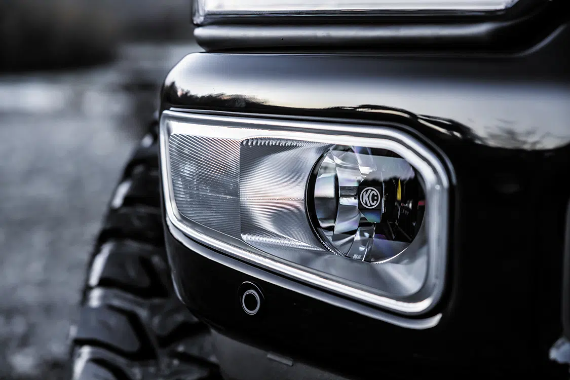 With the cab conversion well taken care of, it was finally time to address the F-350’s exterior. This project was a bucket-list-level build for Kyle, and he truly wanted to see what a modernized free-wheeling-packaged Ford Highboy could look like. Of course, the incorporation of free-wheeling-inspired graphics was a given. Ardor Printing, also located in Snohomish, was asked to apply the high-vis gradient 3M chromatic film to both sides of the F-350, which elevated the factory black paint dramatically. To further push the retro styling of the new truck, a newly developed lightbar from KC HiLiTES gives the front end instant throwback appeal.