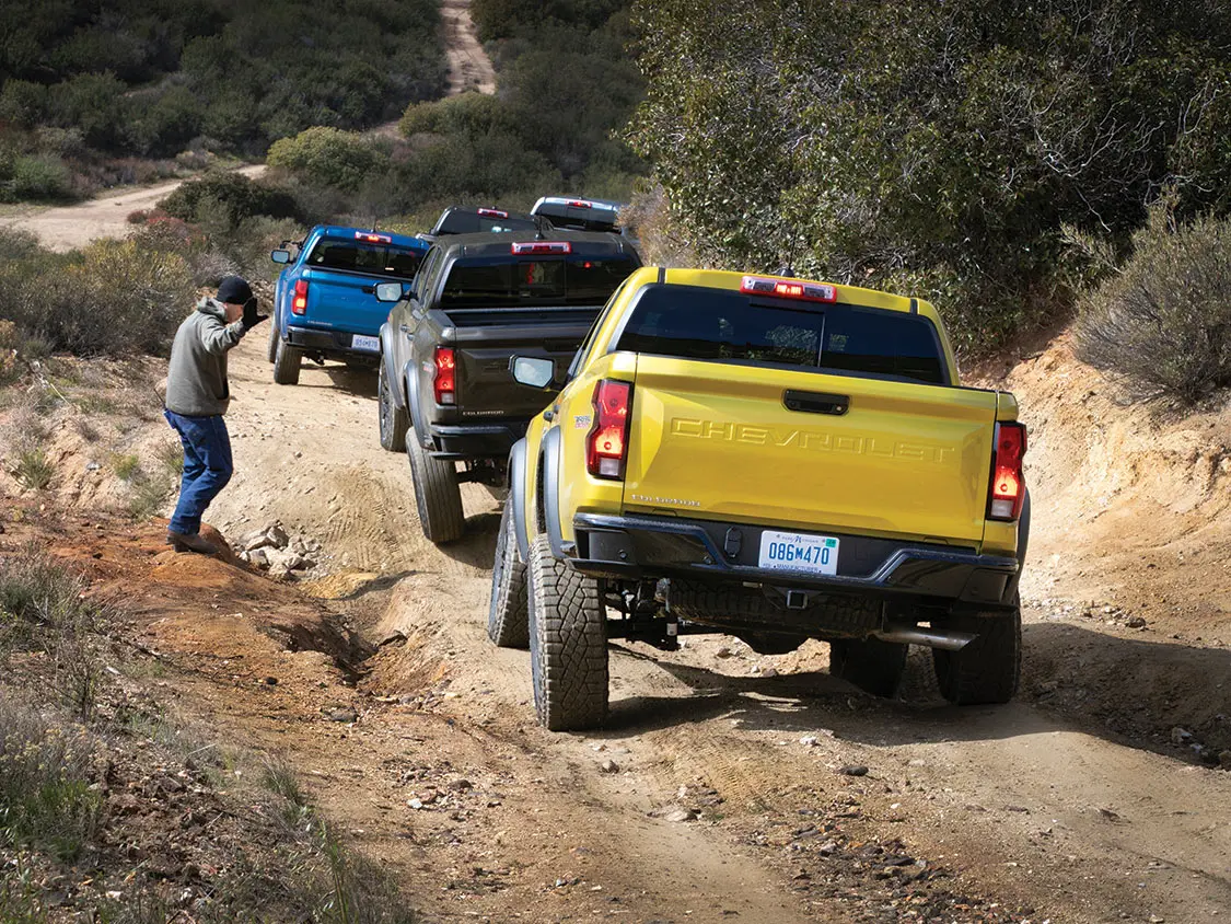 Both Colorado Trail Boss and Z71 were chomping at the bit for harder challenges than the trail we drove. Armed with high- and low-range capability, hill descent control, underbody camera (available on the Z71 and ZR2), and off-road and terrain modes, even the least “off-roady” of the off-roading trio, the Z71, was surefooted and could have handled more.