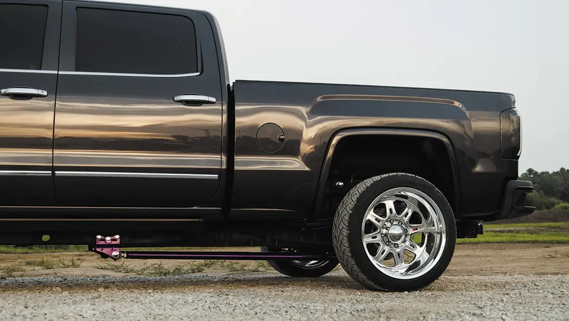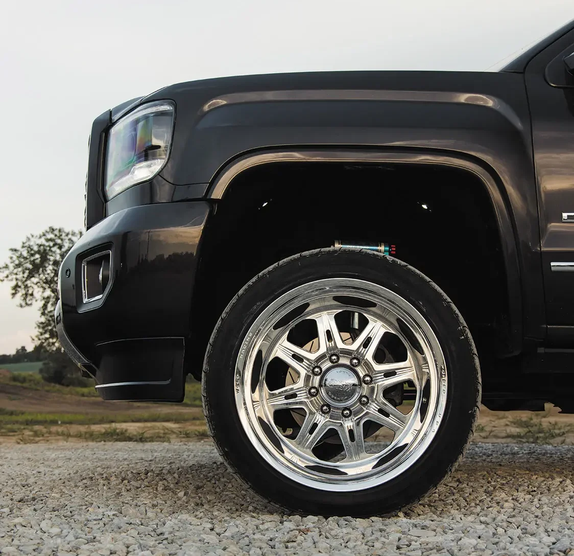 The spring of 2023 brought even more changes to the GMC such as powdercoated leaf springs, sway bars and torsion bars, a retrofitted 2020+ GM LED grille emblem onto the truck’s older style grille, as well as a set of 22×12 Weld Cheyenne wheels from 2005 that saw a ton of work before they could be bolted on.