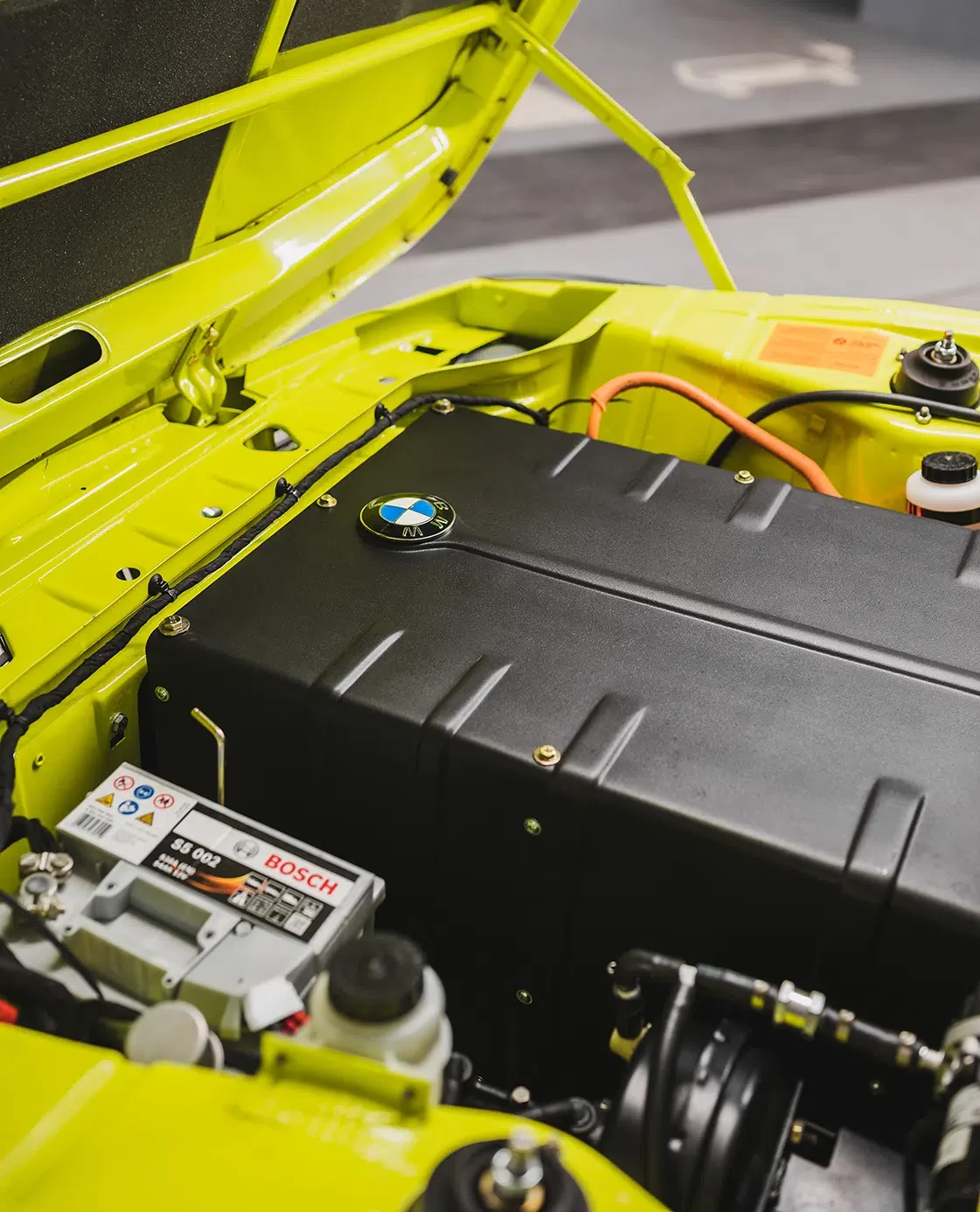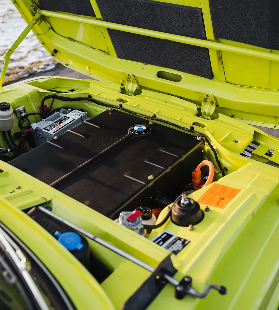 Step inside, and you’re transported back to an era of analog delight. The cabin is a harmonious mix of nostalgia and innovation. Bucket seats provide a comfortable perch, while a Momo Prototipo steering wheel with the Bavarian Econs insignia awaits your touch. The familiar 2002 instrument cluster has been cleverly retrofitted to sync with the car’s electric powertrain. The tachometer now acts as a power meter, displaying the percentage of power being sent to the rear wheels and the regenerative braking input. The fuel meter has transformed into a battery charge gauge, while the temperature gauge now monitors the battery’s health.