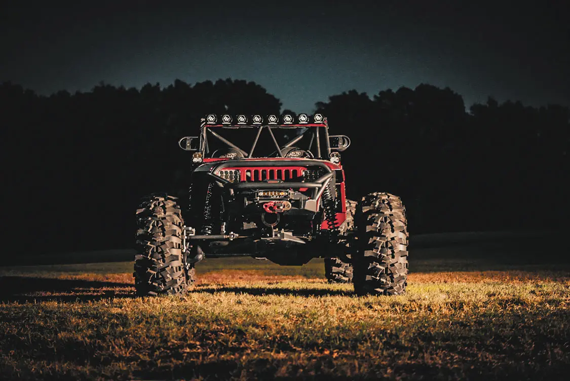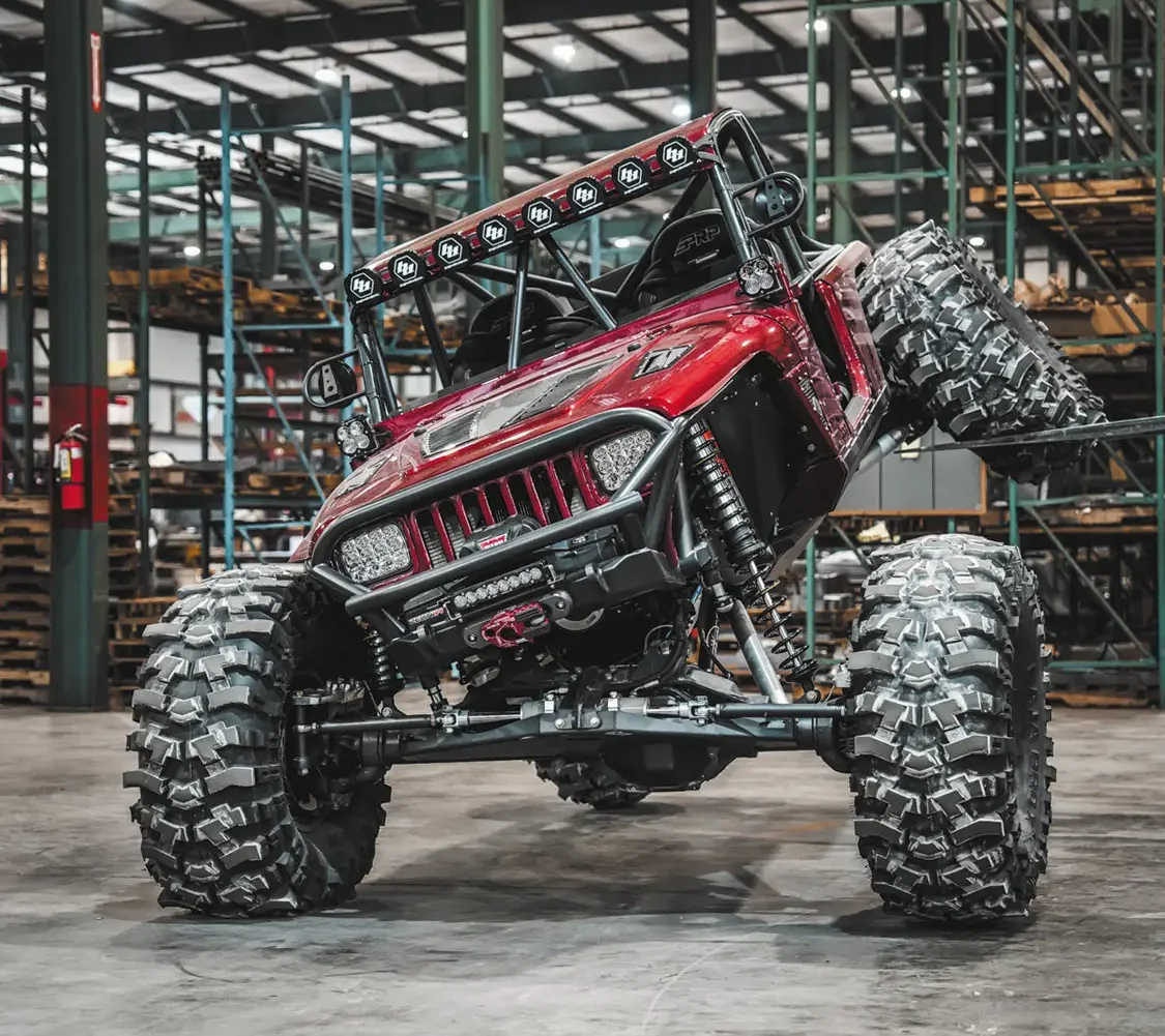 Body was cut and stretched with MotoBilt 15-inch Stretch Back Half Kit; MotoBilt Cut-In fender flares; MotoBilt hood vent kit; LED tractor headlights; Two Baja Designs Squadron XL lights mounted on the A Pillar; Baja Designs 8 XL Linkable light bar; Baja Designs OnX6 10-inch light bar mounted to the winch; Two Baja Designs Squadron Pro LED wide cornering back up lights; Baja Designs LED rock light kit; Warn Zeon 12 winch with synthetic rope and 12,000lb pulling capacity; Factor 55 Ultra Hook; Factor 55 fairlead mount; 2023 Cadillac Radiant Red paint laid by Ozark Collision Center