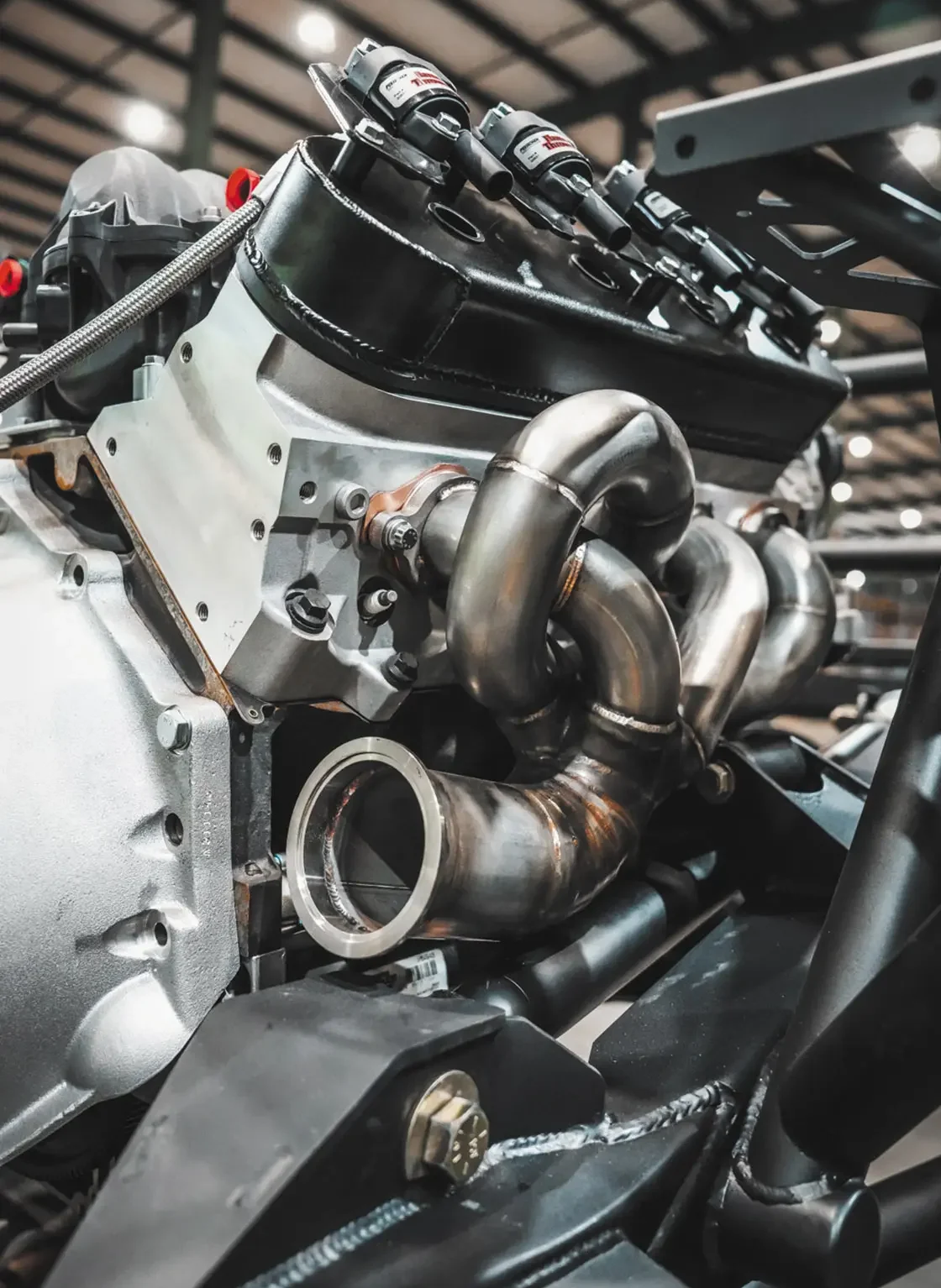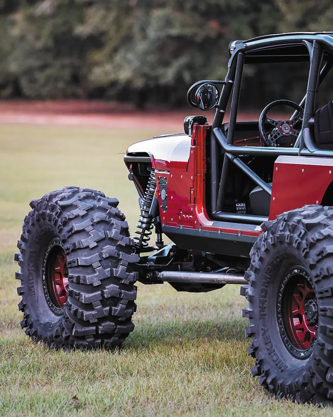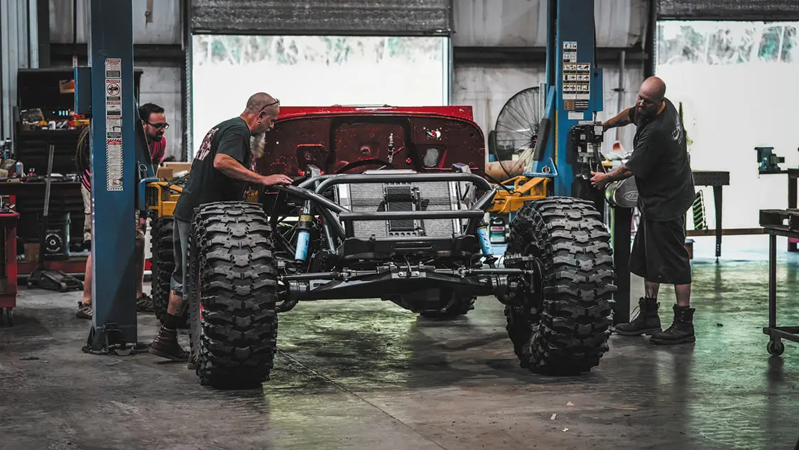 454ci LSX from Golen Engine Service featuring a Dart SHP Pro cast iron block; zero-decked, honed, and bored to 4.185 inches; ARP main studs; Golen LS3 CNC ported three-angle performance valve job with 70cc, stainless steel 2.165-inch intake, 380 CFM at .650-inch lift, stainless 1.6-inch exhaust valve with PAC double valve spring, and ARP head bolts; GM Factory 1.6 ratio rocker arms with upgraded trunnions; Brian Tooley Racing 0.83-inch wall hardened pushrods; FAST LSXR LS3 intake; 102mm drive-by-wire throttle body; Bosch 52lb USCAR fuel injectors; FAST billet fuel rails; Callies Compstar 4340 forged steel crank with 4.125-inch stroke, internally balanced front and rear with a 58x reluctor wheel; Callies Compstar 4340 forged H-beam 6.125-inch rods; ARP 2000 rod bolts; Wiseco forged pistons with anti-friction coating and GFX rings; Comp Cams hydraulic roller lifter cam; 0.627/0.632-inch lift and 243/251 duration at at 0.050-inch lift; 114 lobe separation angle; Holley LS swap oil pan; GM timing cover, rear cover, and lifter valley cover; MotoBilt underbody fuel cell with skid plate for the 15-inch stretch back half kit (available soon!); Holley Terminator X fuel injection system; 1 7/8-inch headers dumping into a fully custom 3.5-inch exhaust system; Maximum Transmission Turbo 400 transmission with custom Reid housing; 3500 RPM stall converter; Art Carr-Winters gated transmission shifter; Atlas 2 Pro 3.0 32-spline transfer case with 300m gears; driver drop with cable shifters; Fusion shaved 14-bolt front and rear axles with 73.5 wheel mounting surfaces and 8-lug x 6.5-inch bolt pattern; 5.38 Yukon Gears with 40-spline ARB air lockers; 4340 40-spline chromoly axle shafts with 1550 U-Joints and 40-spline drive flanges; Reid Racing high-steer knuckles; Adams 4×4 1350 CV heavy-wall rear drive shaft; Adams 4×4 1350 2-piece front drive shaft with carrier bearing