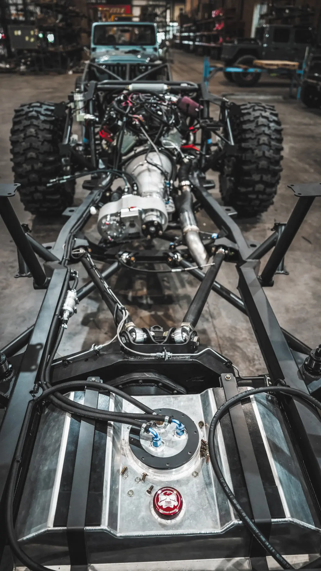 The custom interior of the Jeep follows suit with PRP seats and harnesses, a custom dash and center console, handmade grab bar, and laser etching with custom “El Jefe” engravings throughout. A key fob push-button start, Holley EFI Pro Dash instrumentation, Switch-Pros panels, and a JOES Racing 12-inch drag racing steering wheel are just a few of the extras featured inside. Of course, it wouldn’t be an off-road-ready rig if it weren’t for the custom rollcage, Rugged Radios 696 Plus communication system, and MotoBilt mounting panel for a Milwaukee PACKOUT system.