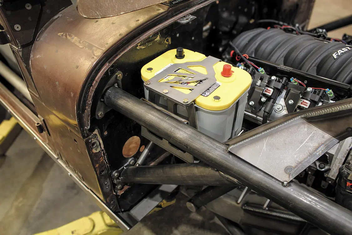 Custom interior featuring PRP seats and harnesses; Custom dash; Custom center console; Handmade grab bar; Laser etched accents and unique El Jefe engravings Custom rollcage; Two sets of Switch Pros 12-panel units; Holley Pro Dash instrumentation; Joes Racing 12-inch drag racing steering wheel with MotoBilt center cap and Sweet Mfg. quick release mount; Key Fob push-button start; Rugged Radios 696 Plus communication system; MotoBilt small mounting panel for Milwaukee PACKOUT