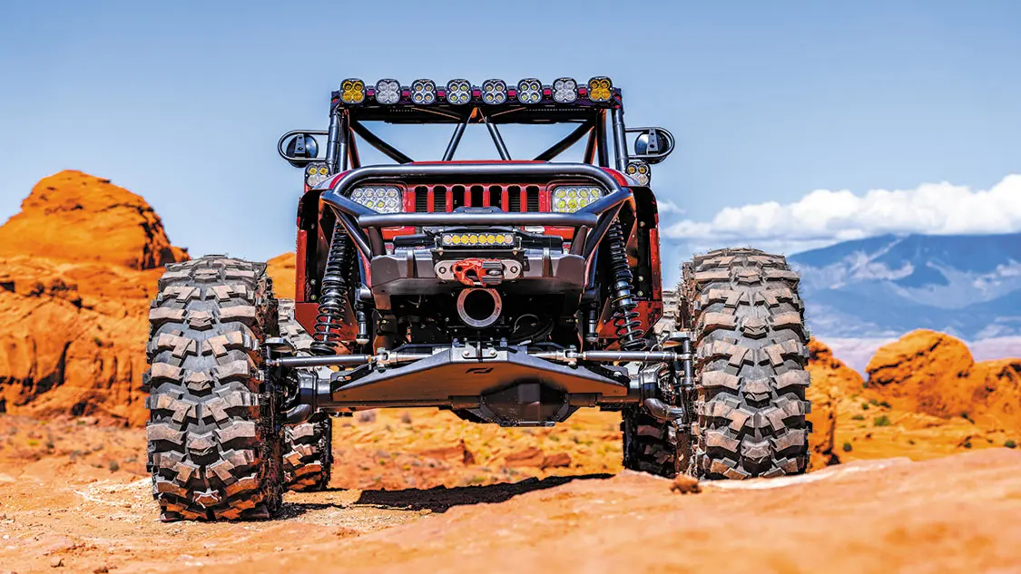 Building off of a full tube chassis, Dan started his Jeep build with the MotoBilt Front Half Frame Kit as well as the 15-inch Stretch Back Half Kit, stretching the YJ’s chassis and body considerably. To this he mated the MotoBilt Double-Triangulated 4-link system with 2.5-inch lower and 2-inch upper aluminum links from Summit Machine, as well as 1.25-inch Heim joints. Fourteen-inch front and 16-inch rear Fox 2.5-inch piggyback coilover shocks with DSC adjusters were used to take the YJ’s suspension to a higher level, adding in Locked Offroad adjustable air bumps with MotoBilt bump stop pads for added ride quality. PRP limit straps give the suspension added support in extreme flex situations.