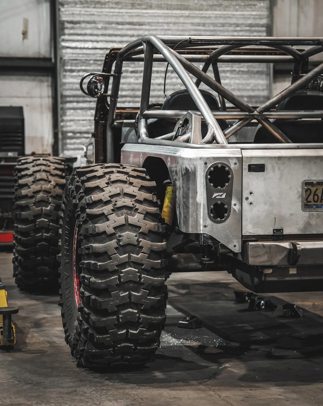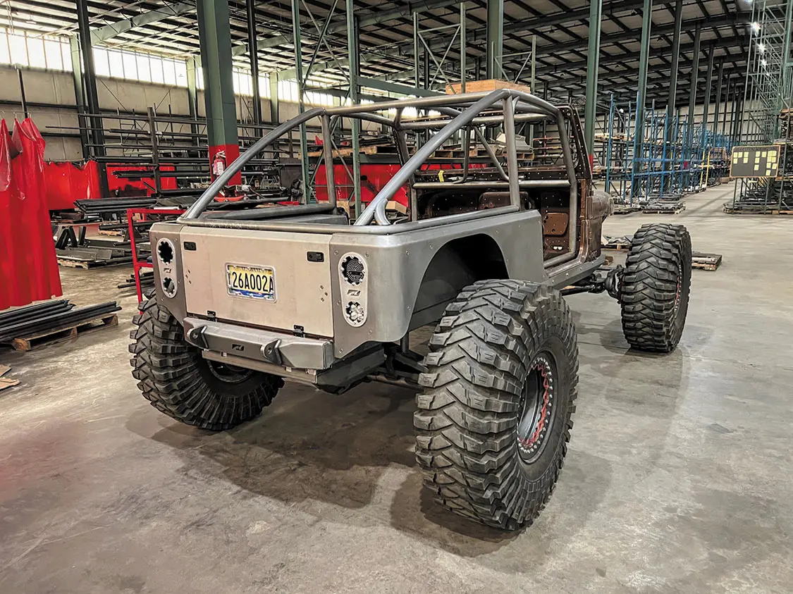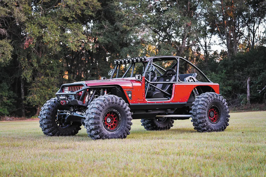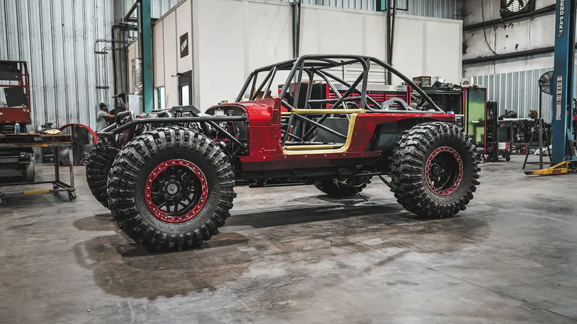 454ci LSX from Golen Engine Service featuring a Dart SHP Pro cast iron block; zero-decked, honed, and bored to 4.185 inches; ARP main studs; Golen LS3 CNC ported three-angle performance valve job with 70cc, stainless steel 2.165-inch intake, 380 CFM at .650-inch lift, stainless 1.6-inch exhaust valve with PAC double valve spring, and ARP head bolts; GM Factory 1.6 ratio rocker arms with upgraded trunnions; Brian Tooley Racing 0.83-inch wall hardened pushrods; FAST LSXR LS3 intake; 102mm drive-by-wire throttle body; Bosch 52lb USCAR fuel injectors; FAST billet fuel rails; Callies Compstar 4340 forged steel crank with 4.125-inch stroke, internally balanced front and rear with a 58x reluctor wheel; Callies Compstar 4340 forged H-beam 6.125-inch rods; ARP 2000 rod bolts; Wiseco forged pistons with anti-friction coating and GFX rings; Comp Cams hydraulic roller lifter cam; 0.627/0.632-inch lift and 243/251 duration at at 0.050-inch lift; 114 lobe separation angle; Holley LS swap oil pan; GM timing cover, rear cover, and lifter valley cover; MotoBilt underbody fuel cell with skid plate for the 15-inch stretch back half kit (available soon!); Holley Terminator X fuel injection system; 1 7/8-inch headers dumping into a fully custom 3.5-inch exhaust system; Maximum Transmission Turbo 400 transmission with custom Reid housing; 3500 RPM stall converter; Art Carr-Winters gated transmission shifter; Atlas 2 Pro 3.0 32-spline transfer case with 300m gears; driver drop with cable shifters; Fusion shaved 14-bolt front and rear axles with 73.5 wheel mounting surfaces and 8-lug x 6.5-inch bolt pattern; 5.38 Yukon Gears with 40-spline ARB air lockers; 4340 40-spline chromoly axle shafts with 1550 U-Joints and 40-spline drive flanges; Reid Racing high-steer knuckles; Adams 4×4 1350 CV heavy-wall rear drive shaft; Adams 4×4 1350 2-piece front drive shaft with carrier bearing