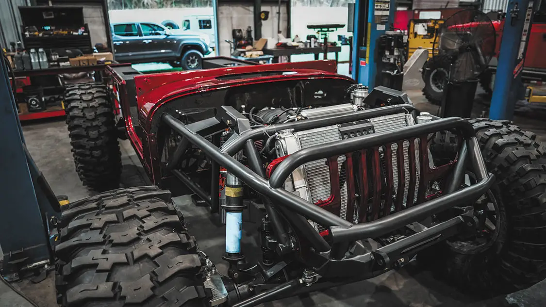 Body was cut and stretched with MotoBilt 15-inch Stretch Back Half Kit; MotoBilt Cut-In fender flares; MotoBilt hood vent kit; LED tractor headlights; Two Baja Designs Squadron XL lights mounted on the A Pillar; Baja Designs 8 XL Linkable light bar; Baja Designs OnX6 10-inch light bar mounted to the winch; Two Baja Designs Squadron Pro LED wide cornering back up lights; Baja Designs LED rock light kit; Warn Zeon 12 winch with synthetic rope and 12,000lb pulling capacity; Factor 55 Ultra Hook; Factor 55 fairlead mount; 2023 Cadillac Radiant Red paint laid by Ozark Collision Center