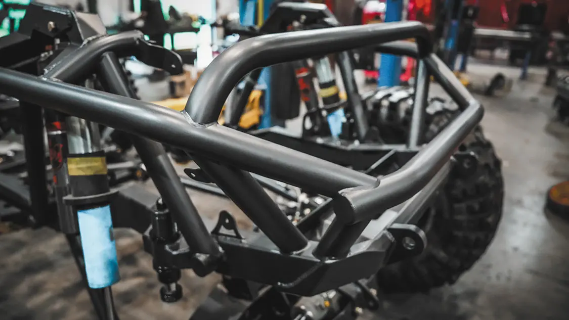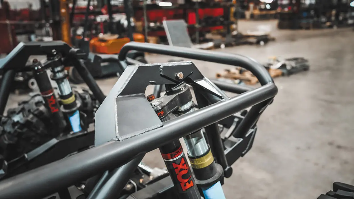 Full tube chassis; MotoBilt Double-Triangulated 4-link system with 2.5-inch lower and 2-inch upper aluminum links from; Summit Machine; 1.25-inch Heim joints; Fox 2.5-inch piggyback coilovers with DSC adjusters; 14-inch front and 16-inch rear; Locked Offroad adjustable air bumps with MotoBilt bump stop pads; MotoBilt upper coilover shock mounts for Highline Fenders in the rear; MotoBilt Front Half Frame Kit; MotoBilt 15-inch Stretch Back Half Kit; MotoBilt 14 bolt front and rear axle trusses for 4-inch diameter tubes; Ram mount in front (front setup available soon!); MotoBilt axle upper control arm mounts for truss in the rear; MotoBilt universal fuel access hatch; PRP limit straps; PSC Motorsports double-ended 2.75-inch ram full hydraulic steering