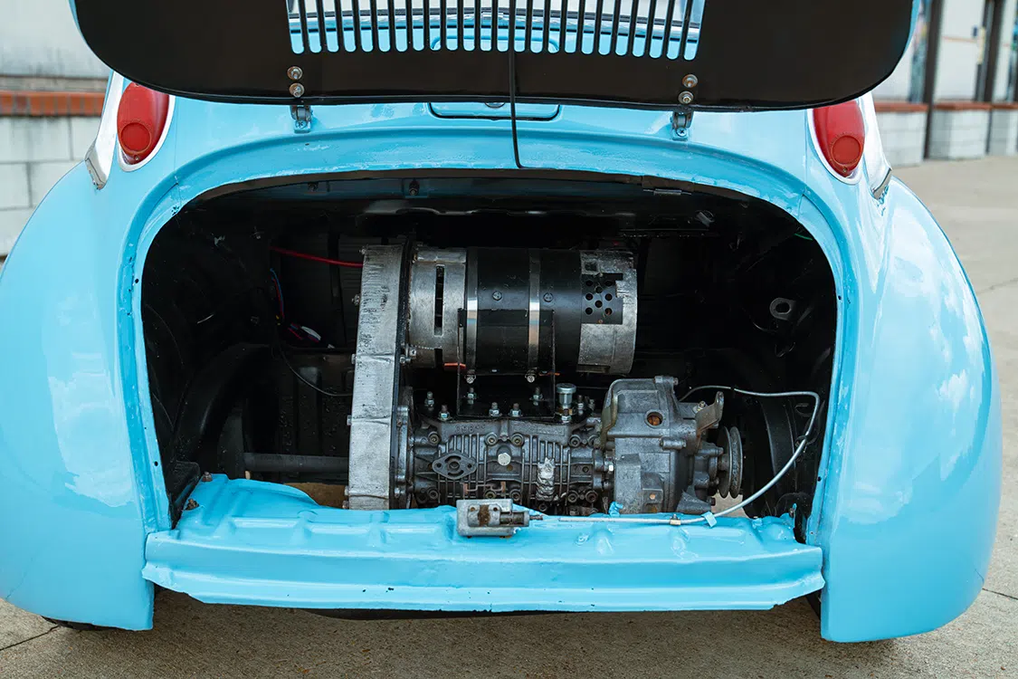 The original Subaru 360 engine presented a plethora of issues—missing parts, bent rods, and a piston with a hole, among others. Salvaging the crankshaft bearings and removing the piston rods marked the starting point. The electric motor took the place of the cylinders, connected by a chain to the crankshaft. The motor mounting plate, sourced from the Taylor Dunn, was meticulously aligned with the Subaru block. Custom-made sprockets from Motion Industries in Jackson, Mississippi, upheld a 1:1 ratio between the motor and the crankshaft. A specially crafted bracket supported the electric motor’s weight, occupying the space previously reserved for the cylinders. Retaining the rest of the Subaru drivetrain maintained the car’s original essence.