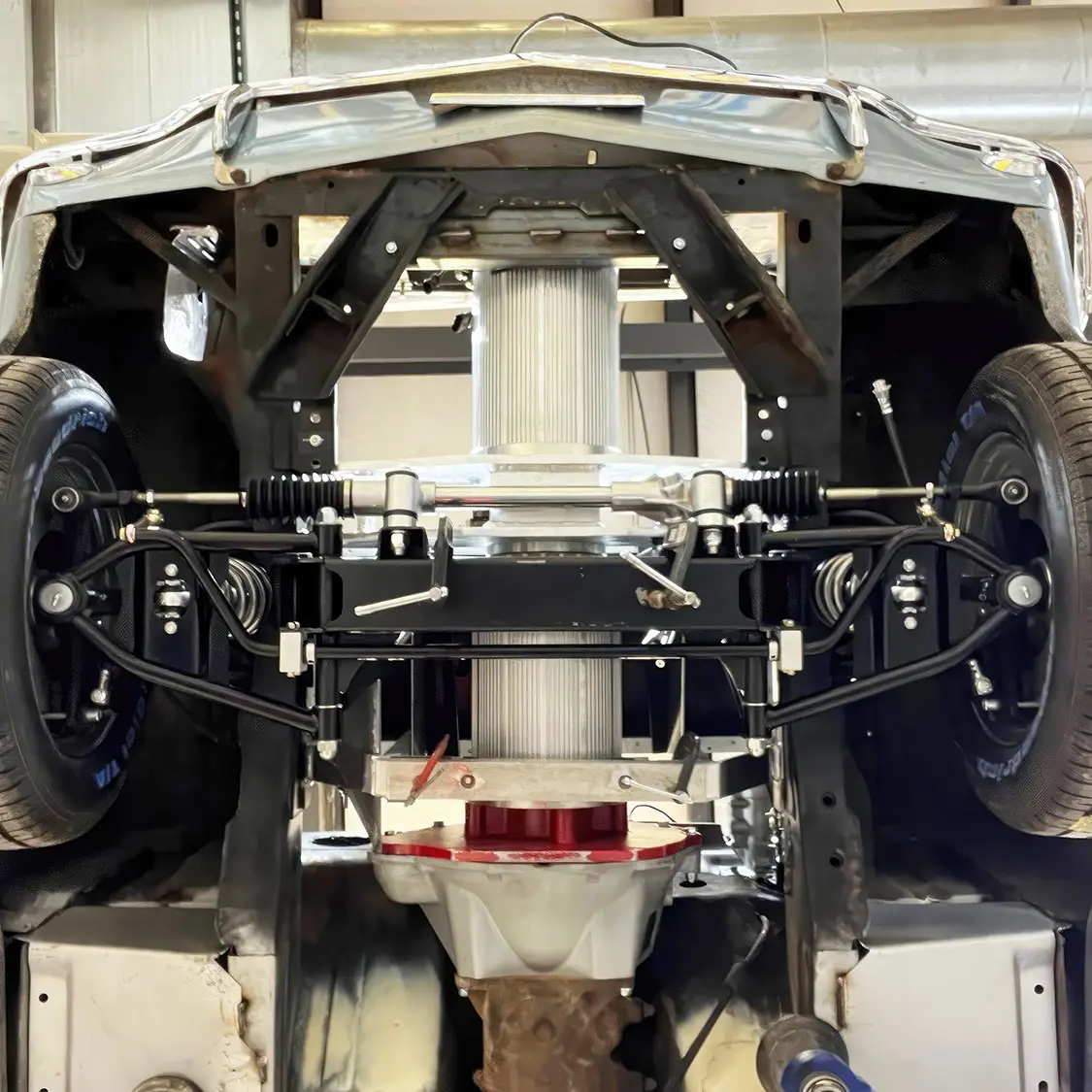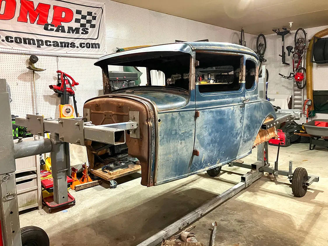 The F2E team visiting Pete Storey at Southern Street Machines where its ’66 Mustang is being converted.
