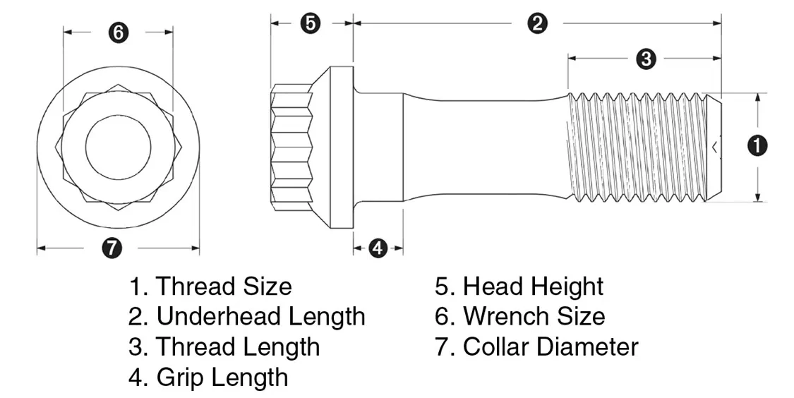 When procuring heavy-duty replacement bolts for suspension use it’s important to make sure all the dimensions are the same. This includes the shank diameter, underhead length, thread length and grip length. Other variables are the collar diameter, thread pitch, head type and height.