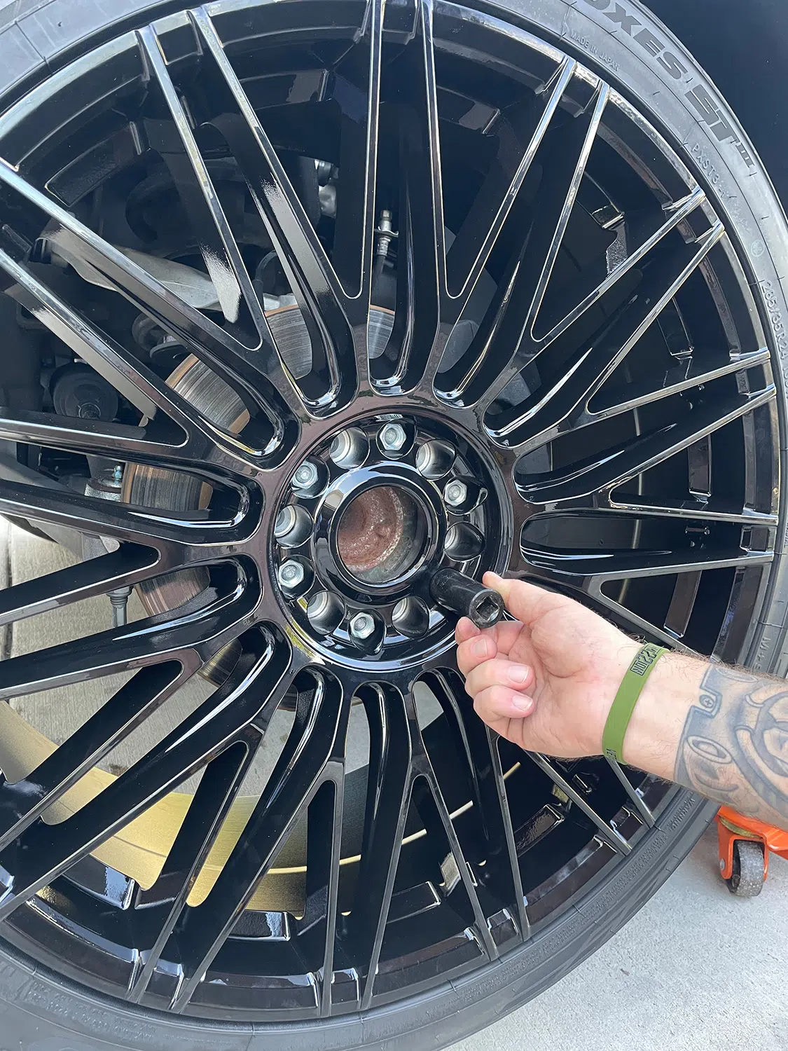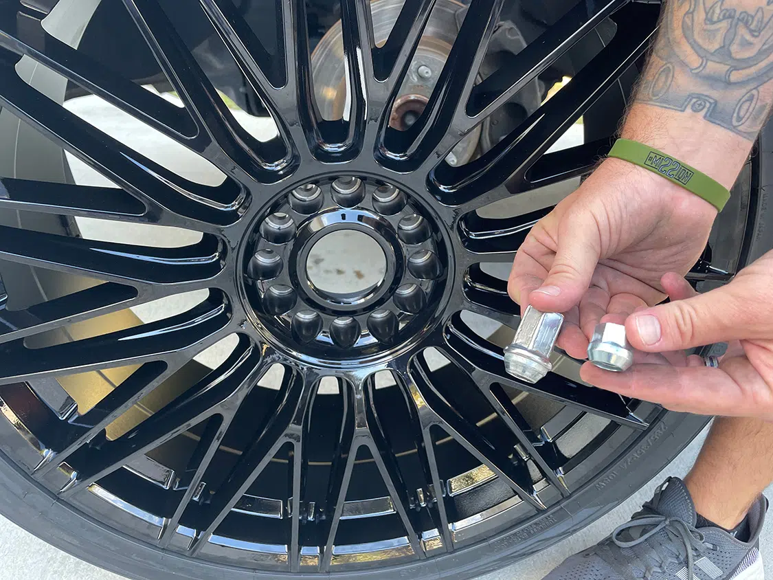 11. When installing the new wheels, proper lug nut selection and tightening are crucial as well. These Fittipaldi wheels will require a set of new acorn-style lug nuts, as the factory ones are incompatible.
