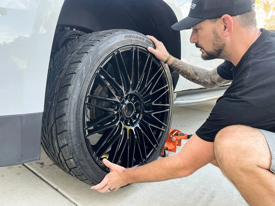 15. With the lug nuts tight and the center cap installed, we lowered the truck to the ground and removed the jack. This is when you should feel all around the tire and inside the wheelwell to be certain there is no rubbing or touching anywhere.