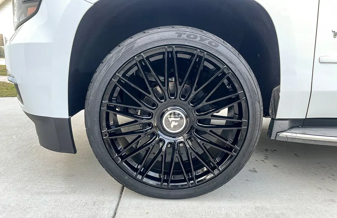 For our project, we chose the Large Diameter SUV Mesh Wheel 369 from Fittipaldi Wheels. Crafted from A356 aluminum alloy and T6 heat-treated, these wheels offer unparalleled strength without compromising style. The captivating mesh pattern, available in gloss black and mirror coat finishes, promises an eye-catching aesthetic. We paired with these killer looking wheels with Toyo Proxes ST III tires sized 285/35-24, providing both performance and style to complement our Tahoe’s upgrade.