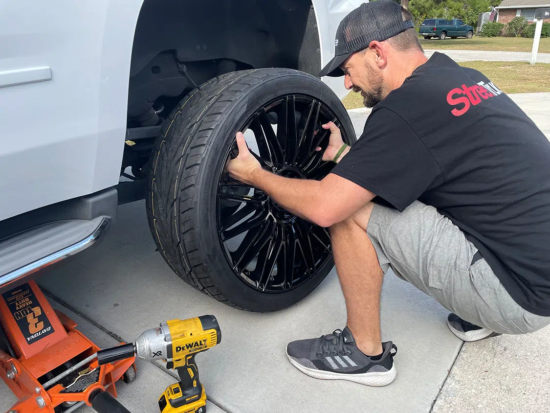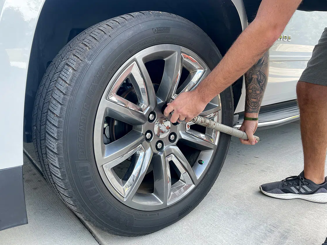 07. While the mounting and balance process is being handled, we will use a breaker bar to crack the lug nuts loose before jacking up the truck. We do not recommend making your impact gun do all the work here.