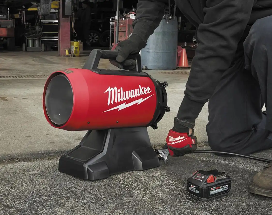 The Milwaukee M18 70,000 BTU Propane Heater delivers best in class heat output. With AC/DC functionality and ergonomic design, it can easily be transported and used in various well-ventilated environments. A straightforward user interface promotes quick ignition, and on-board storage allows its 10-foot hose and regulator to be stored directly on the unit. Powered by a high-output brushless electric motor, it can run for up to 8 hours on an M18 XC 5.0 battery (batteries and charger sold separately). Other features include: