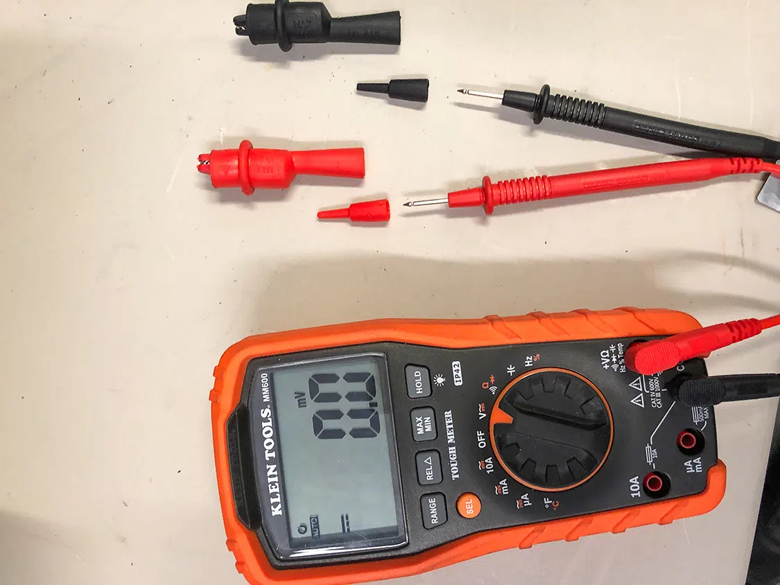 First, verify you are using a Digital Multimeter (DMM) and test the probes that are rated to handle the voltage necessary to ZVV your circuit—CAT III (1000V working voltage) or above is recommended. Plug your leads into the DMM port to measure DC voltage and place insulated caps on your leads. If necessary, to ensure the test probes are CAT III rated.