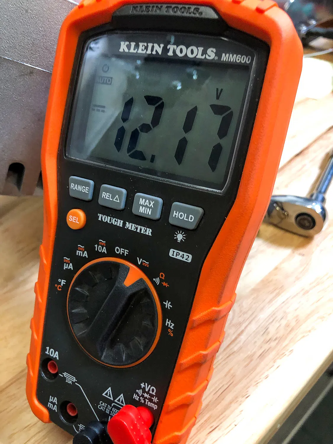 Using a known voltage source, like a 12V battery, test the voltage. If the DMM is working properly, the reading should reflect the known voltage.