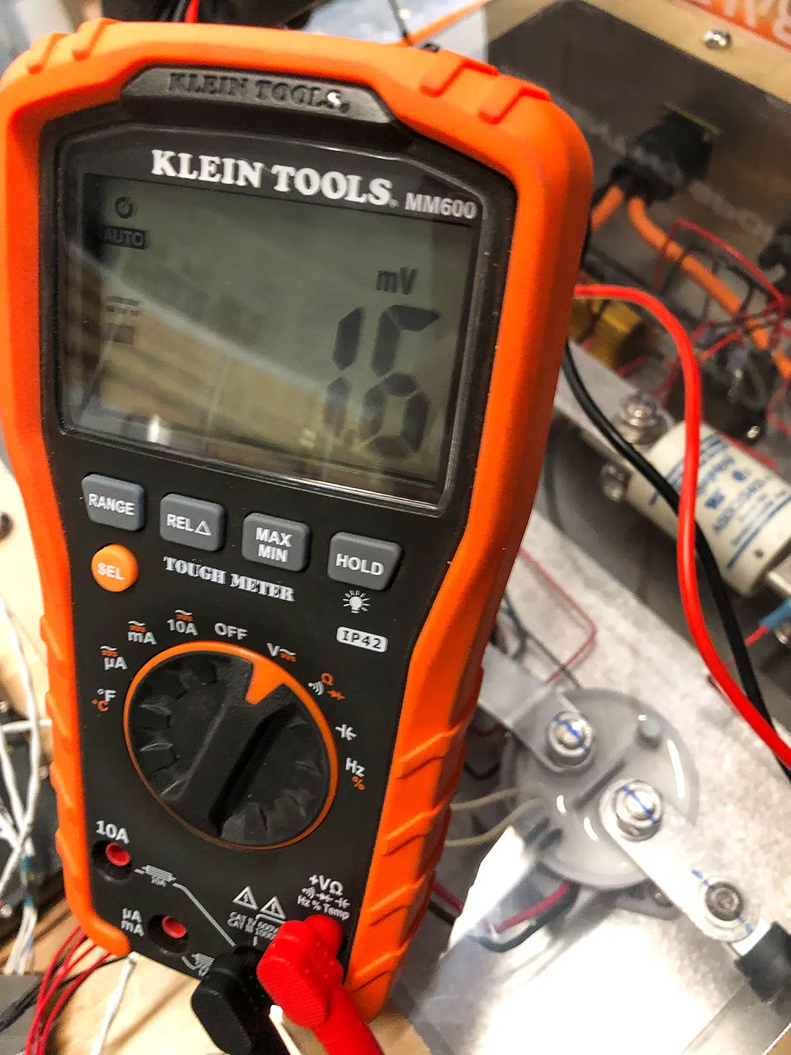 Now, test the voltage of the high voltage component(s) being worked on. The DMM should report a voltage of ~0 volts or something very close to 0 volts, like 1.6 mV, pictured here, that shows a small amount of residual voltage. Residual voltage is common when working with electrical components that contain capacitors and inductors, even if the component is disconnected from power.