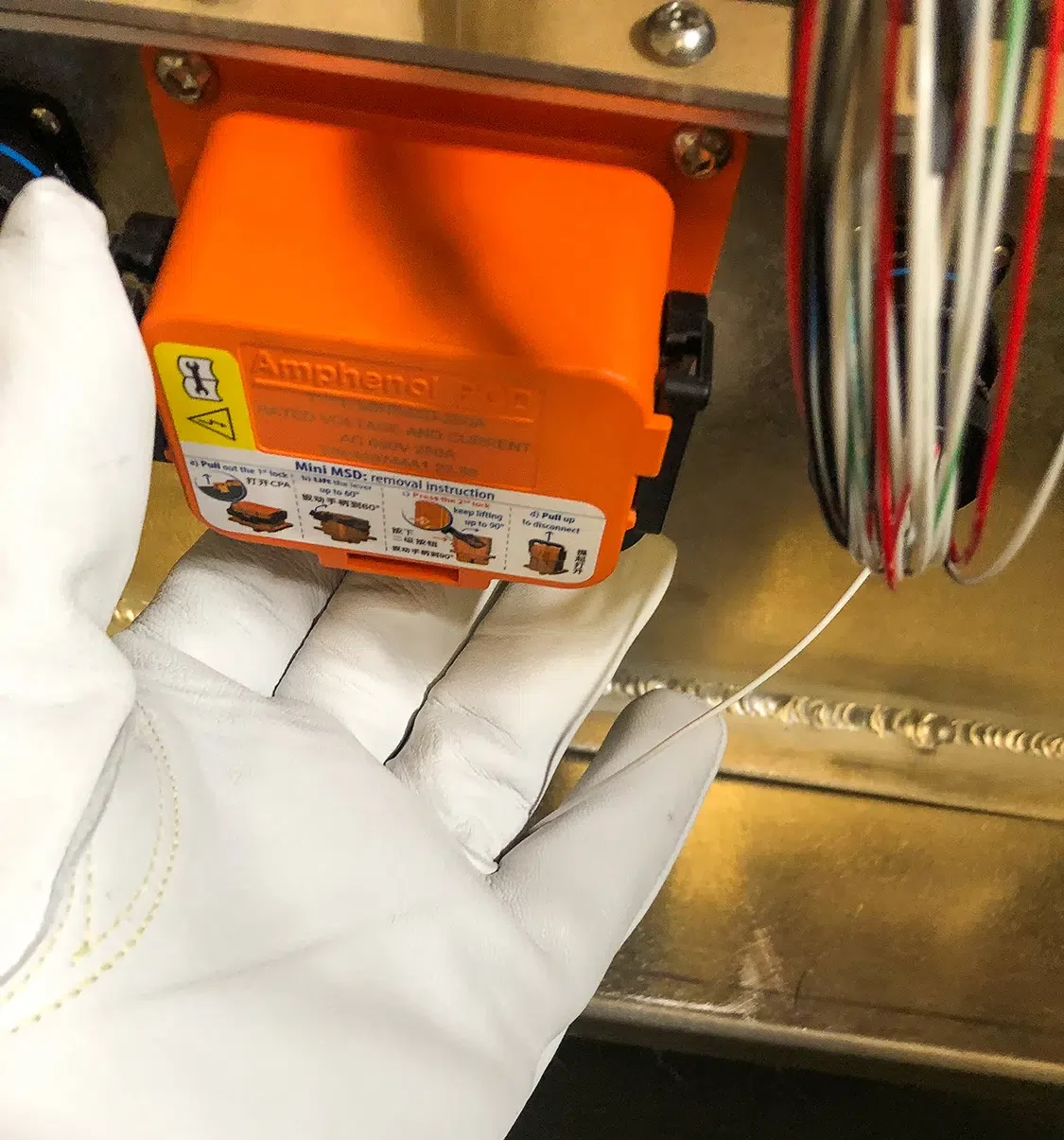 If the vehicle has Manual Service Disconnects (MSD) for the battery packs, you’ll need to disengage those as well. Still wearing PPE, remove each of the MSDs connecting the battery packs. Place a dummy plug or protective cover over the female end of the connection on the battery packs to prevent dust and other contaminants from coming into contact with a high voltage connection.