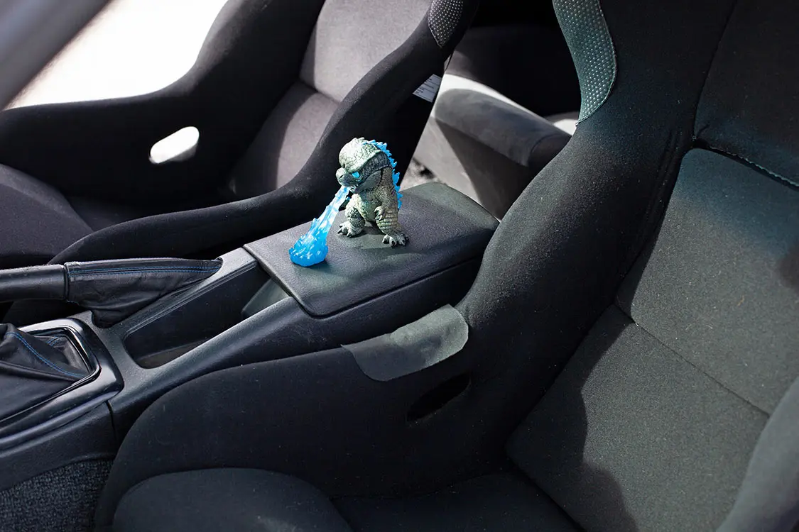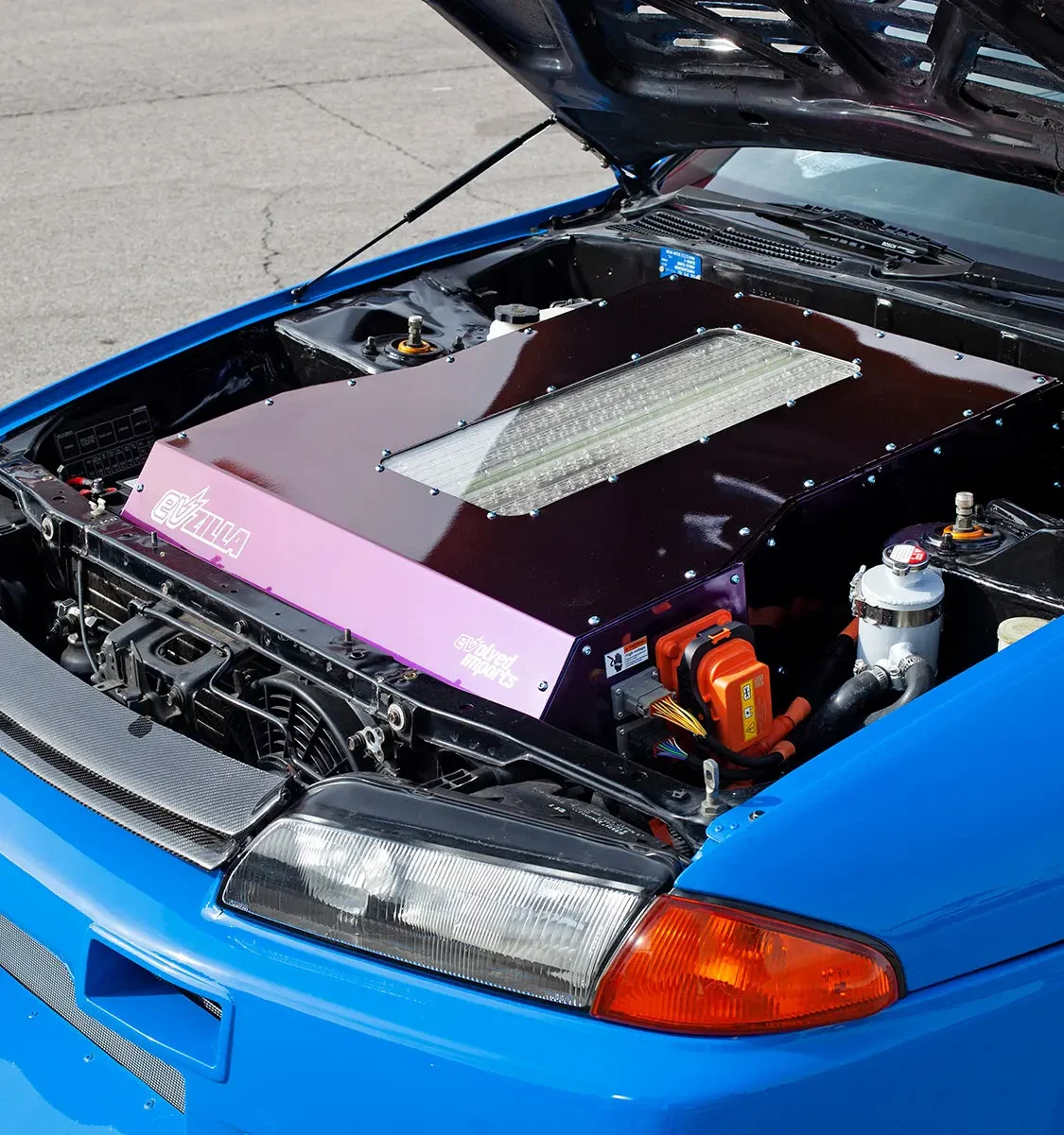 The exterior of EVzilla, painted in the captivating Toyota Voodoo Blue by Next Level Paint, reflects Eric’s discerning taste. Carbon fiber accents, a Jun body kit, Nismo N1 headlights, and custom LED tail lights further showcase a marriage of aesthetics and aerodynamics.