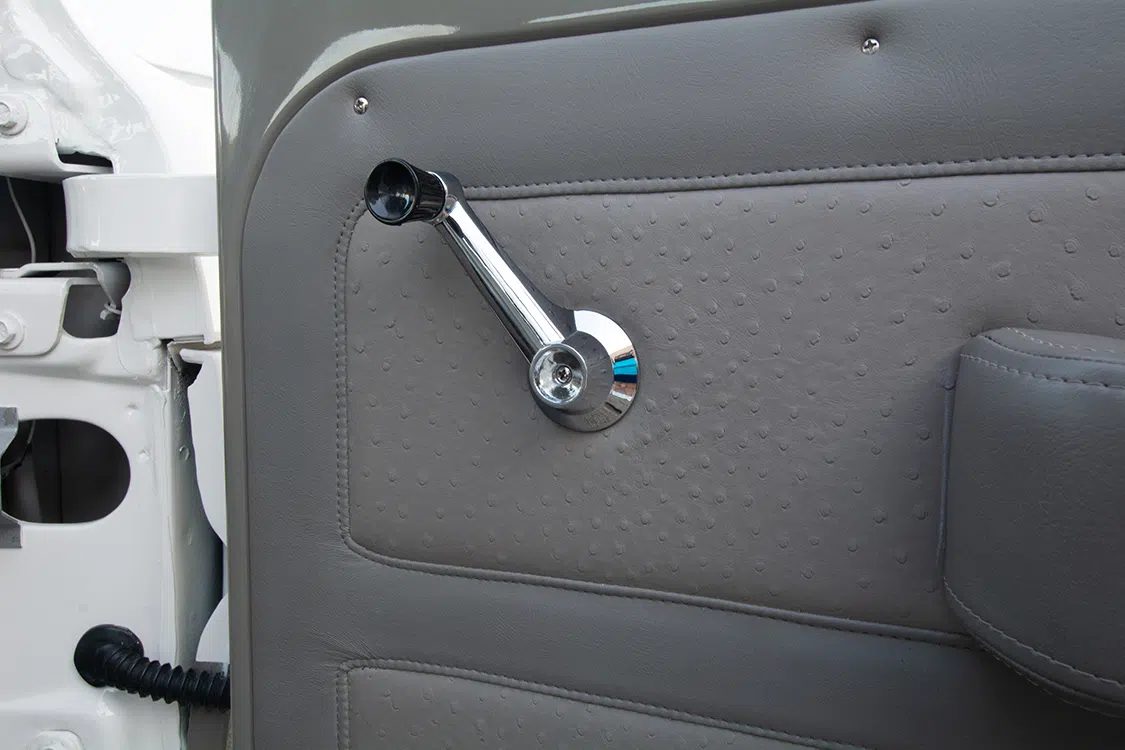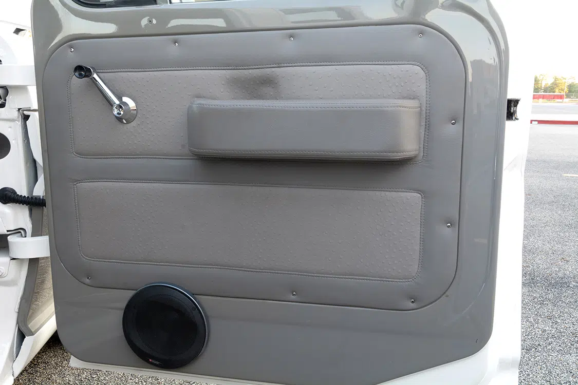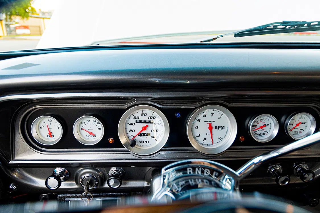 The interior was next to go underneath the knife, but just like the rest of the build so far, the customizations were to be tastefully done. The factory bench seats were utilized and covered in gray vinyl by Spring Auto Upholstery, which is also located within Tomball’s city limits. The door panels were also attended to and have been cleaned up to match the fresh upholstery work of the seats. An LMC Truck steering wheel adds some shine to the interior space, as does a chrome Ididit steering column. Nothing over-the-top has been done within the confines of the cab, and that is exactly what David was gunning for.