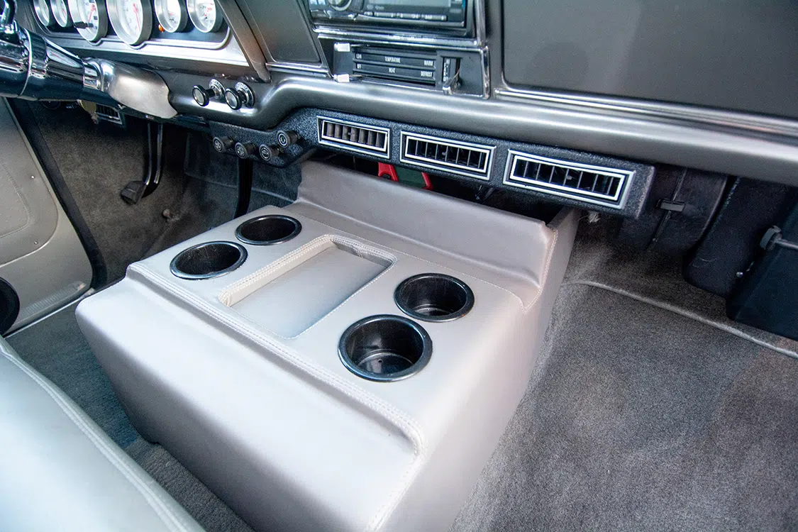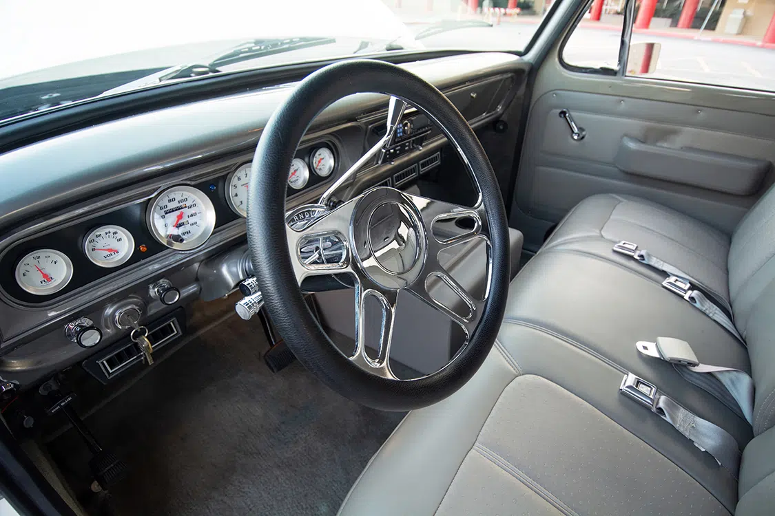 An LMC Truck steering wheel adds some shine to the interior space, as does a chrome Ididit steering column.