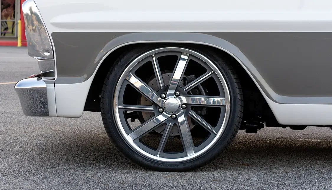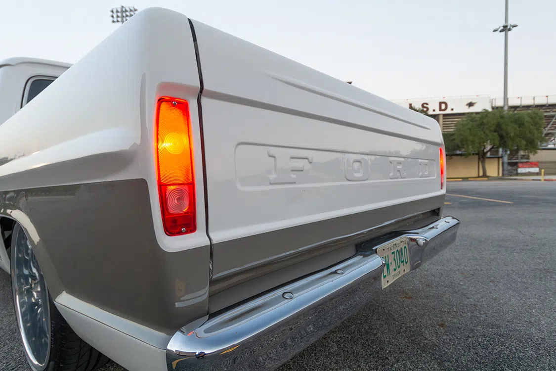 Next on the agenda was to focus on smoothing out and refinishing the truck’s 51-year-old exterior. David’s vision was to have the truck look super clean with very modest modifications that would make for a streamlined, timeless façade. David kicked off the bodywork by extending the rear wheel tubs and welding and filling the bed seams and stake holes to create a much smoother appearance. Professor’s Street Rods was once again sourced to extend the lower body line at the rear of the bed before Concourse Services, also located in Tomball, skillfully applied the PPG Shelby Performance white and taupe hues, along with a custom-mixed shade of pewter to add contrast to the color palette.