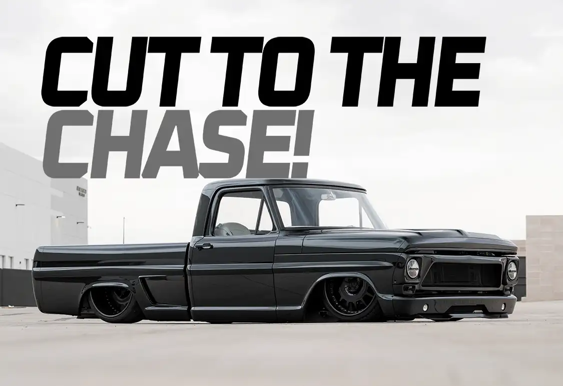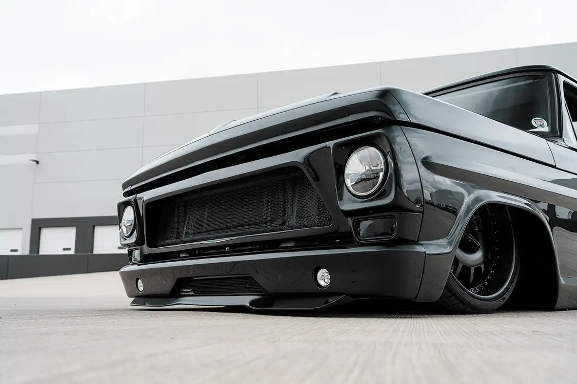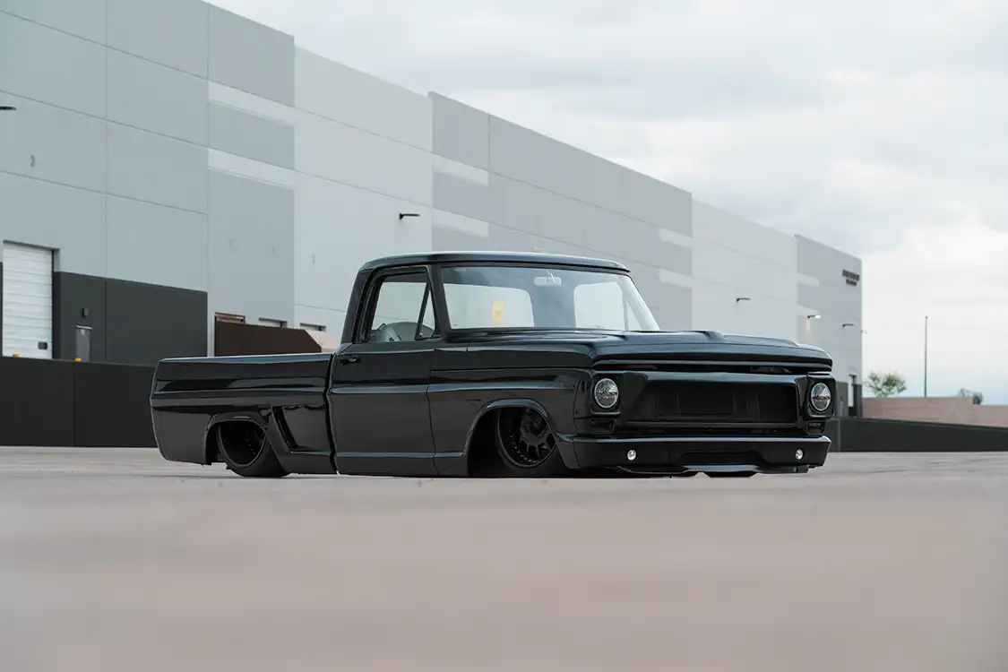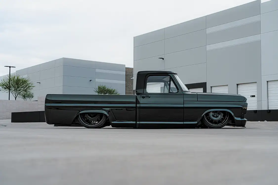 Fat Fender Garage has teamed up with Porterbuilt Fab to produce specialized chassis systems for classic Ford pickups. The one utilized here is a Level 3 package, which allows the truck to lay frame on the concrete. Sure, it’s low, but there is no sacrificing ride quality here. Air Lift Performance air management components have been plumbed and wired into position to add user-friendly adjustability, and a rear cantilever 4-link setup helps in adapting to all road conditions. 22-inch Avant Garde wheels and Pirelli P Zero rubber contribute to the look of the F-100’s low-slung stance and overall on-road performance.