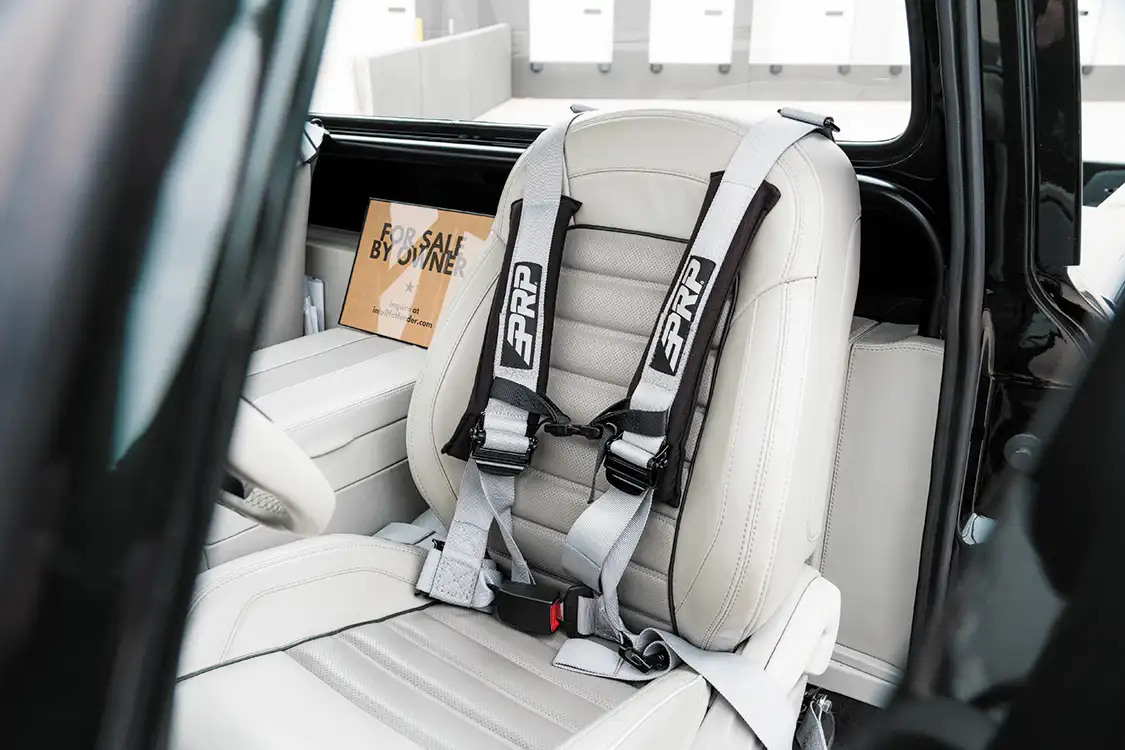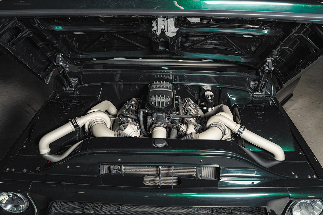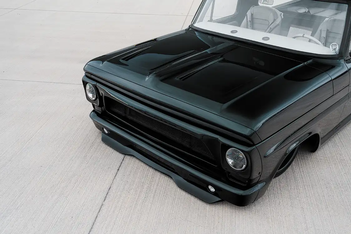 Speaking of performance, a 2017 Ford Gen 2 Coyote engine serves as the centerpiece of the Bullitt F-100’s horsepower production. Lending an assist are twin Garrett GTX35 turbos, as well as headers and an exhaust system that were fabricated in-house. All tubing within the engine bay was Cerakoted to lower thermal radiation and lend a hand in color coordination. An automatic 6R80 transmission allows for smooth sailing through the truck’s near-800 horsepower count, which has been carefully tuned to avoid the unruly tendencies of having that much muscle.