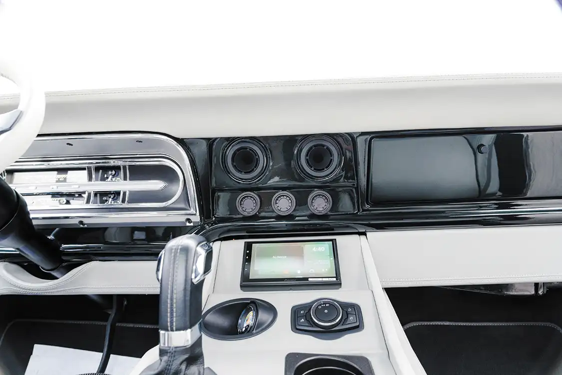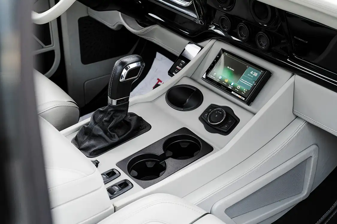 Just in case Jason feels like mashing down on the gas pedal, however, the modified 2018 Mustang GT seats have been paired with proper PRP racing harnesses to keep him firmly planted. The rest of the interior has been well-thought out by the crew at FFG to evoke a sporty, sophisticated cockpit with striking design and upholstery work, as well as the inclusion of familiar late-model amenities such as the shifter with manual shift function and the headlight control knob. Other electronic creature comforts include Dakota Digital gauges, cold-blowing A/C, and a full audio system that cranks on demand.