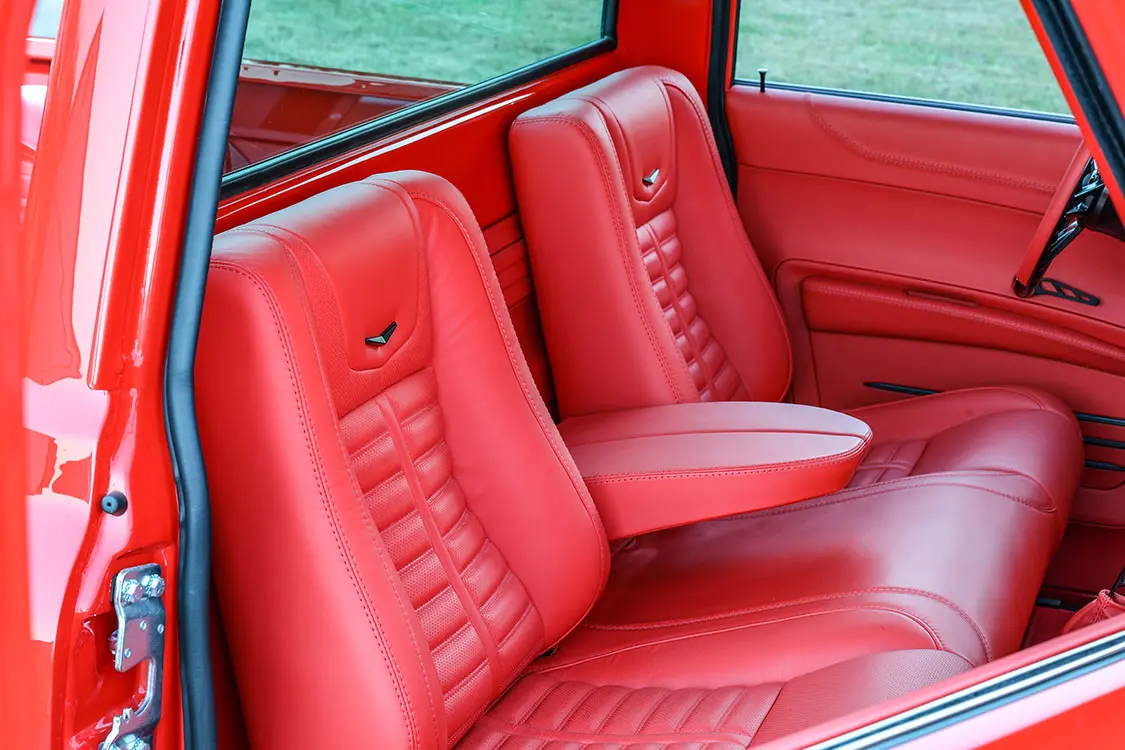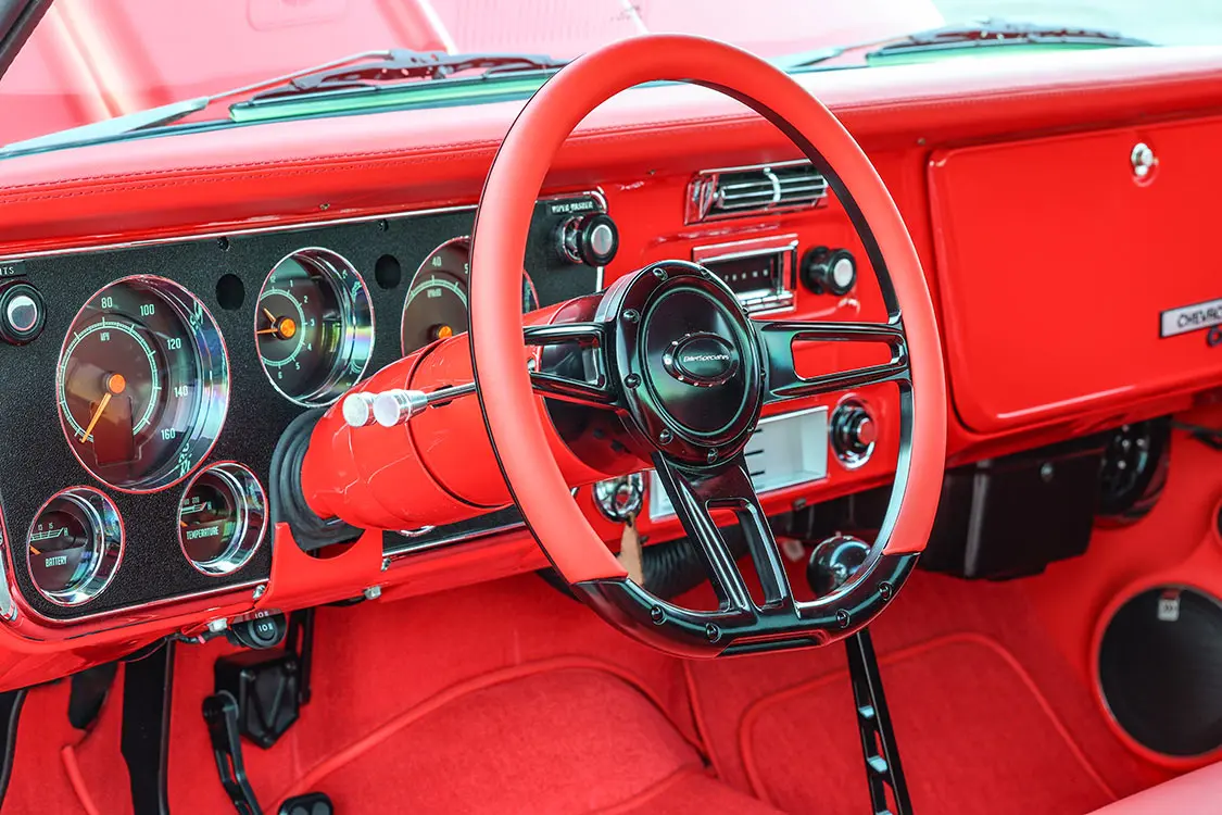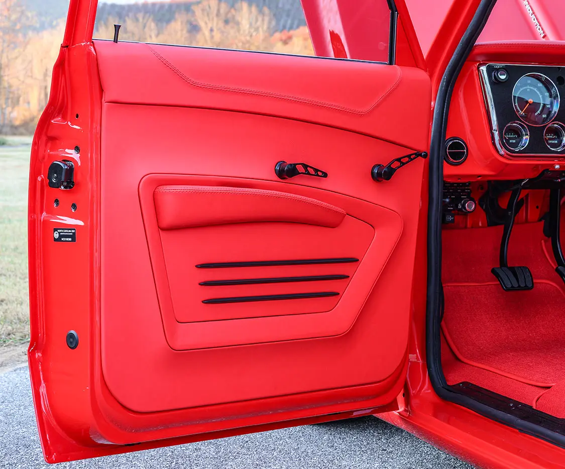 Inside, the color scheme continues with the metalwork finished in the same Guards Red color from the dash to the steering column. The carpet and upholstery follow suit, with custom leather door panels, kick panels, and a bench seat built with a TEA’s Design frame and specifically tailored foam. Even the dashpad and custom panel behind the seat were treated to custom leather work, all expertly done by Tom’s Trim Shop of Canton, North Carolina. Dakota Digital RTX Series digital gauges with a black and chrome surround, a black Billet Specialties grid shifter and matching window cranks, and a black and red Billet Specialties D-Shaped Formula 14-inch steering wheel add the finishing touches to the truck’s impressive show-worthy interior.