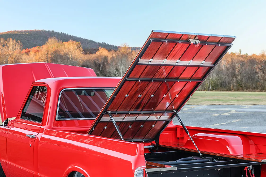 Look under the brilliant red paint and you’ll find body modifications like cut-out front wheelwells and rear wheeltubs from ChubTubz that have been narrowed by 4 inches. The truck also features a custom bed with a liftable center section, revealing added storage underneath. Beyond that, its beautiful polished chrome bumpers and trim pieces, along with custom halogen LMC Truck headlights, give the truck high-end lighting with an old-school look.