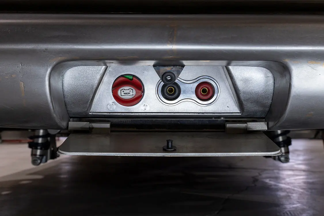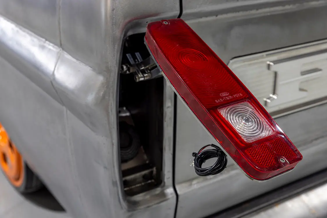 With the engine and suspension departments shown some attention, Sonny soon moved onto working on the Ford’s 60-year-old body. While the truck didn’t come to Taylor in horrible condition, there was some specialty metalworking that just had to be done to give it that look he knew Griffin would wholeheartedly approve of. Sonny was given free rein of the rest of the upcoming modifications such as the customized factory grille, fresh Holley headlights and the addition of one-off ’73 E-100 Econoline bumpers on each end. A one-off double skinned tailgate with billet emblem was fabricated with the addition of a double walled inner bed, fresh rocker panels under the door, and for kicks, a stealthy gas filler placed behind the left taillight. Taylor and Sonny do have a plan in place for paint to come, but you can’t blame the guys for enjoying the truck as it sits in full bare metal—it is a wonderful sight to behold.