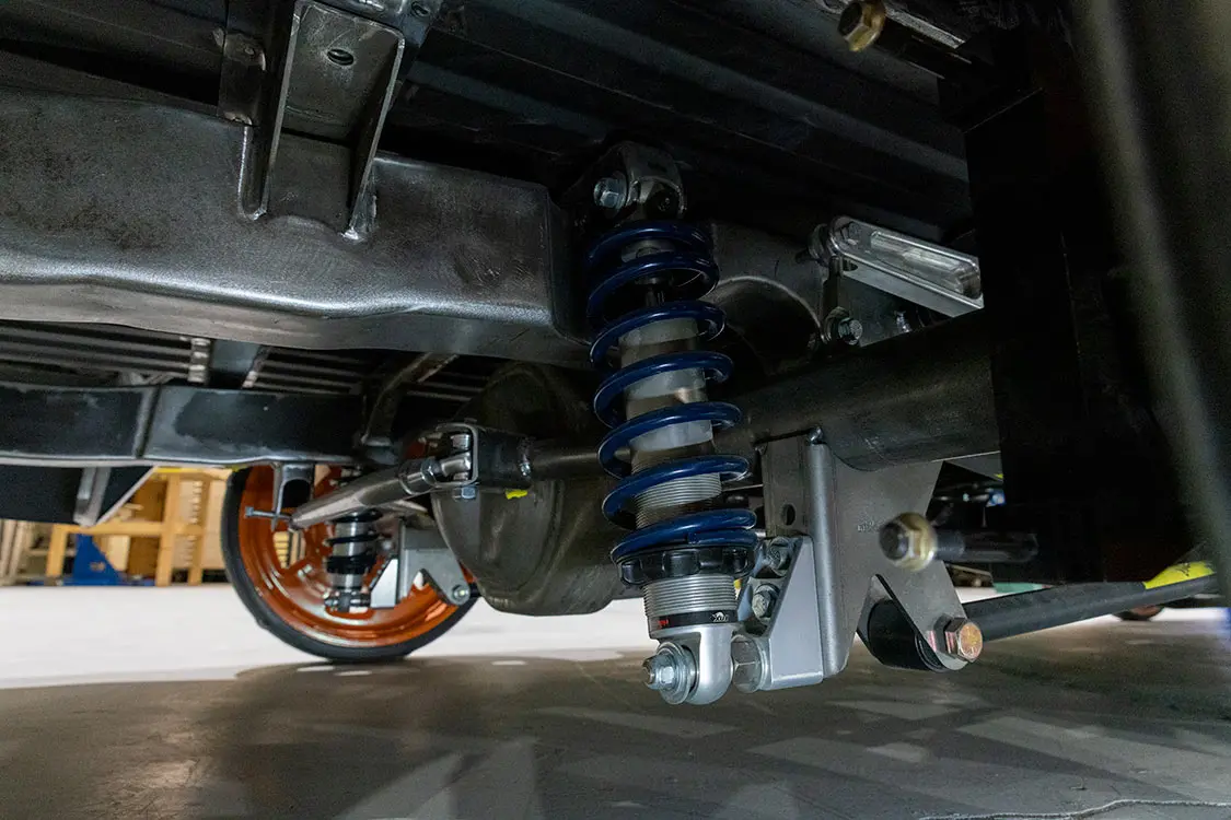 Getting the right stance for the truck was of utmost importance for Taylor, and after bouncing ideas off Sonny on how to get an ideally aggressive ride height, the two settled on a list of modifications to make it happen. To start, Sonny boxed the factory ’63’s frame for rigidity and created exhaust pass throughs that would soon house the custom piping he would later create. A Crown Vic crossmember and Fat Man Fabrications took up residence at the F100’s front end, and a custom 4-link setup was fabbed up along with a through-frame sway bar for the rear. To further promote overall excellent ride quality, Ridetech coilovers were added to each corner to seal the deal on the truck’s modernized chassis system. Upgraded Wilwood braking components for each end were also assembled to ensure the truck’s stopping power would be just as powerful as its momentum.