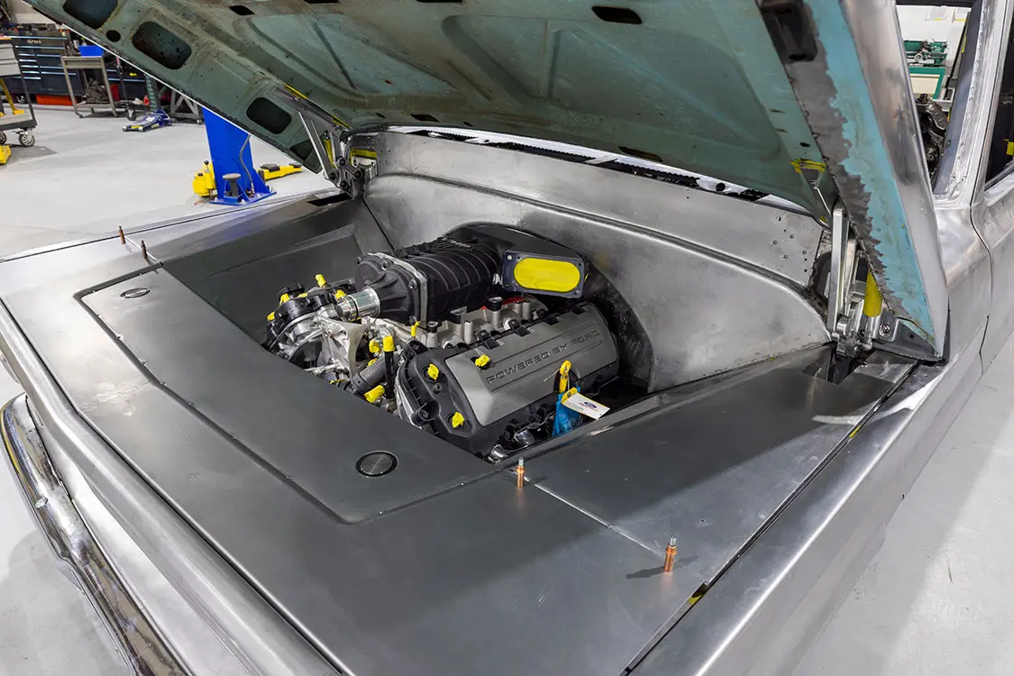 While both Taylor and Griffin enjoyed looking at a clean, classic Ford truck, they were both heavy into performance as well. This is what inspired Taylor to secure a 2019 Coyote engine for his ’63, along with a VMP supercharger to add even more power gains to the mix. Oh, and the Tremec Magnum 6-speed transmission he also got would soon make driving the F-100 an absolute blast. Ordering the major parts and supporting components is one thing, but for the much larger scope of customization as far as fabrication and metalwork goes, Taylor made a great decision in asking Sonny Warner of Sonny’s Speed and Kustoms in Twin Falls, Idaho, to assist in these very important categories and then some. Not only did Sonny help in planting the Coyote engine into place, but he has also constructed sheetmetal paneling within the engine bay to fully preface the compartment with more of his excellent craftsmanship to come.