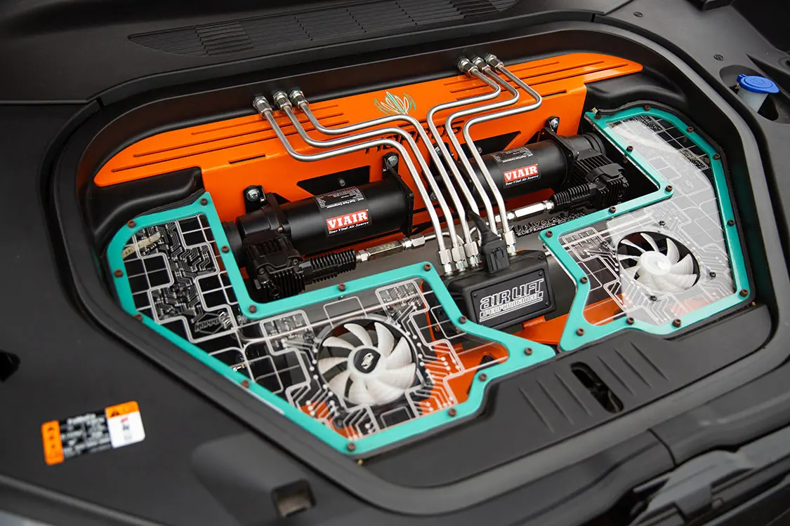 But it doesn’t stop there. Neil has gone above and beyond, fitting his Mustang with an Air Lift suspension system meticulously installed Mr. Alex from Hoppo’s Suspension. With Air Lift struts and Viair compressors working harmoniously, the Tjin Edition Mach-E glides effortlessly along California freeways in comfort. To top it off, the Baer 6S 6-piston front and rear brakes guarantee precise stopping power, instilling confidence in any driving situation.