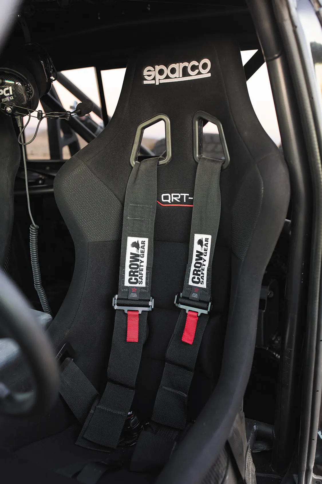 Inside the cab, Guy is greeted to a set of Sparco QRT-C carbon bucket seats and steering wheel, along with a custom console that really has turned the Ranger’s cab into an actual cockpit environment. The Holley Pro Dash system, PCI race radio intercom and the repurposed OEM switches that now control auxiliary lights only further give the interior a control-center feel. The rollcage that takes up the extended cab area is also very cool to see and reassuring to know is there once it’s finally go-time!
