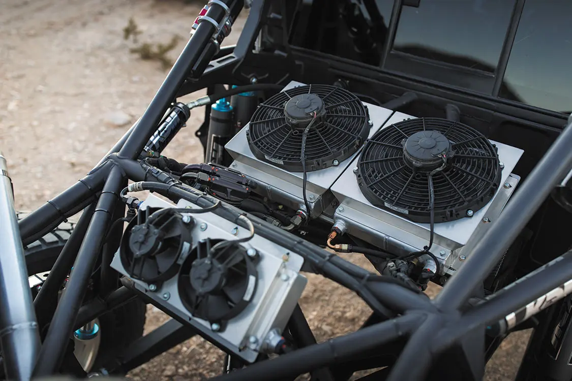 Starting with the suspension system, Guy entrusted the talented BTF Fabrication in Upland, California, to begin fabricating an entire tube chassis tied to the original Ford frame that remains underneath the cab. The BTF team performed a body lift to provide 18 inches of front-wheel travel and 25 inches at the rear, and then affixed King 3.5 triple bypass shocks and 2.5×10 coilovers along with 3.5×16 custom six-tube bypass shocks and 2.5×14 coilovers respectively onto the chassis. KDM shocks field tested the Ranger afterward and was able to provide custom valving services to dial in the system for the best performance possible for a 4×4 long travel race setup.