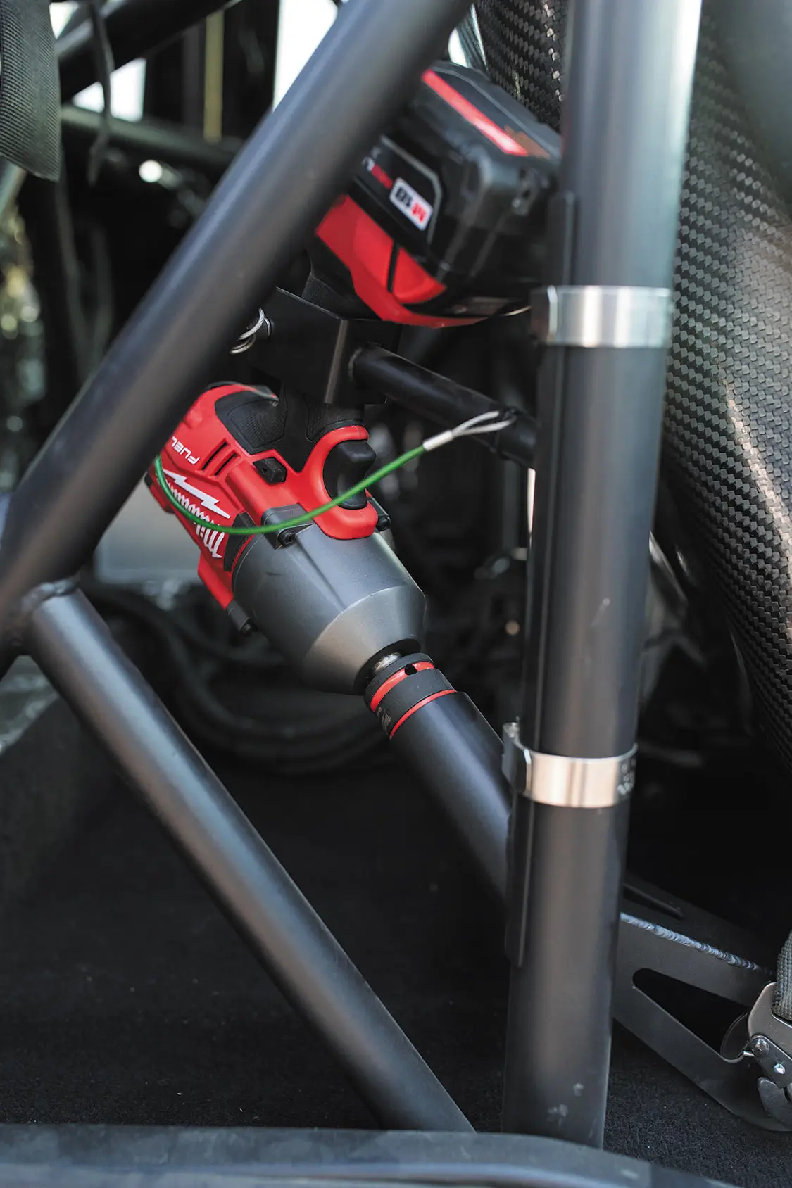Sparco QRT-C carbon bucket seats, steering wheel, BTF Fabrication rollcage, Holley Pro Dash instrumentation, PCI race radio intercom, ORM switches repurposed to control aux lights, Steering wheel push-to-talk wire plugs into cigarette lighter, Gauge dimmer switch controls Cutless Designs dome light