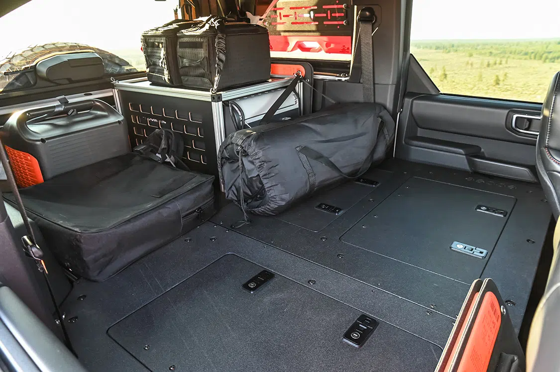 Bonds wanted a build that would allow for various sleeping setups. Sometimes he stops in one place for only a short period. Other times, he likes to set up more of a complete camp and enjoy a great spot for a bit longer. The combination of the Goose Gear storage system and platform, coupled with the TrailRacks roof rack, allows Bonds to easily carry his Gazelle tent on the rack for ground camping, attach a RTT when needed, and even sleep inside the cab on his DeepSleep Mattress when he wants to get in and out of a camp quickly.
