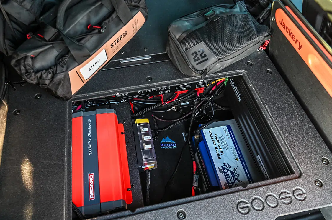 INTERIOR ACCESSORIES: Redarc Manager 30 & RedVision; 100ah Battle Born Battery, 1000W Redarc Inverter; Wouxun KG-1000G GMRS Radio with STEP 22 Gear Quick Mount, SwitchPros, 67 Designs Dash Mounts, Garmin inReach Explorer; Dometic 45L CFX
