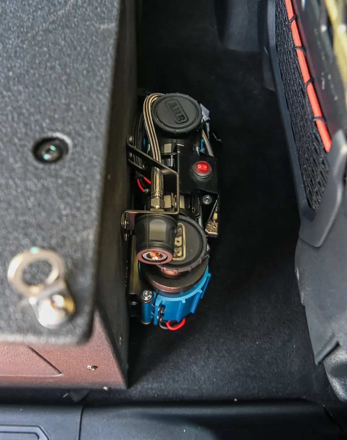 Bonds says his favorite piece of kit on his Bronco is the Redarc Manager 30 and RedVision systems, which he says is “the heart of the truck.” The system keeps everything running and makes all the electrical gadgets super easy to manage. With the addition of a shore power outlet in the rear bumper and portable solar panels, Bonds keeps the fridge cold around the clock and never has to worry about power for his air compressor, camp lights, and power outlets to charge his drones and other toys. Rhino Adventure Gear in San Francisco did all the custom electronics installs.