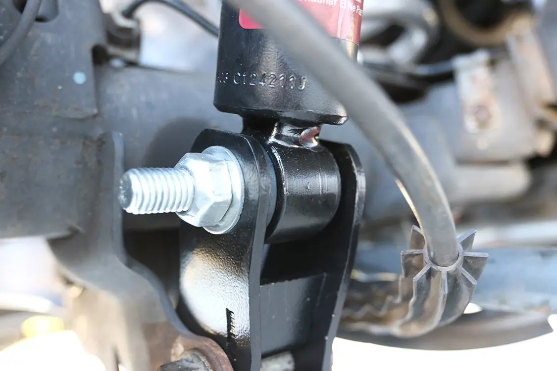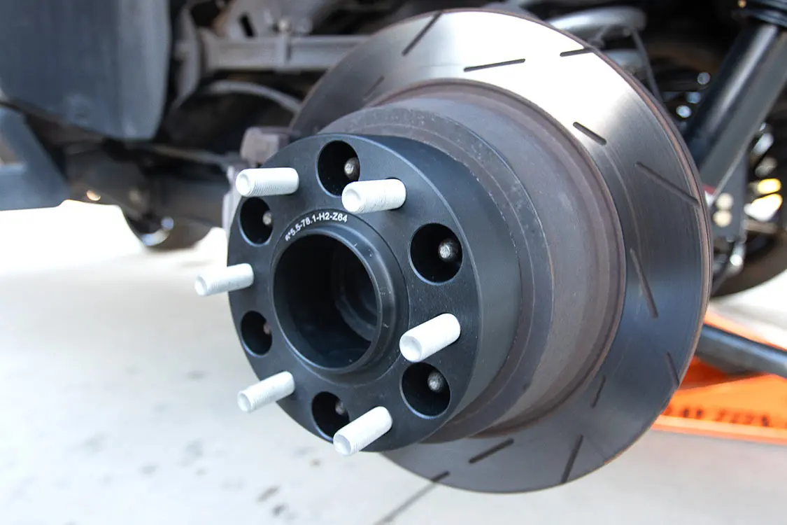 22. The rear shocks also have a new shock extension bracket to raise the lower shock mounting location so we could use a factory replacement for this 2008 Chevy Tahoe.23. With the rear complete and fully installed, the last thing we needed to do was bolt on a rear wheel spacer to match the width of the front due to the new lift spindle installed.