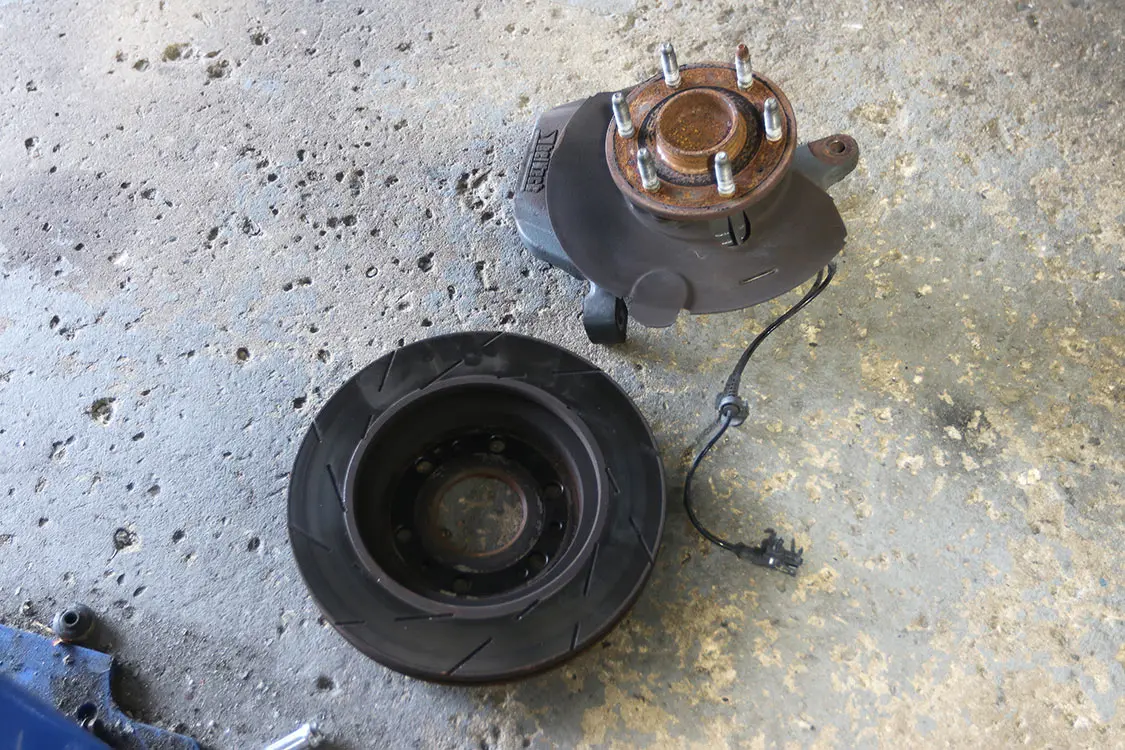15. You can see the dramatic difference between a lowered spindle and a 5-inch lift spindle for a 2008 Chevy Tahoe. The original hub was soon reinstalled on our new spindle to get it back on the truck.